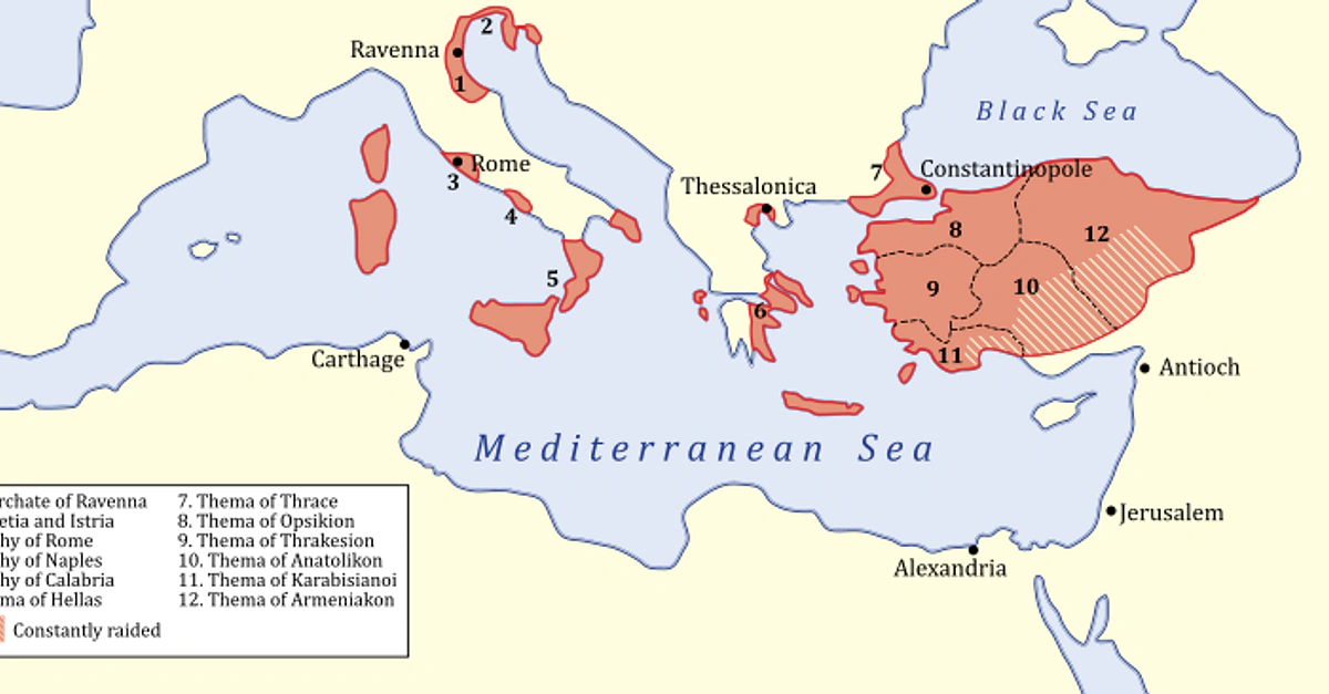 A map of the Byzantine empire and its themes and provinces in 717 CE.