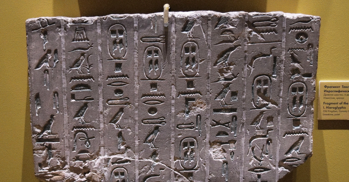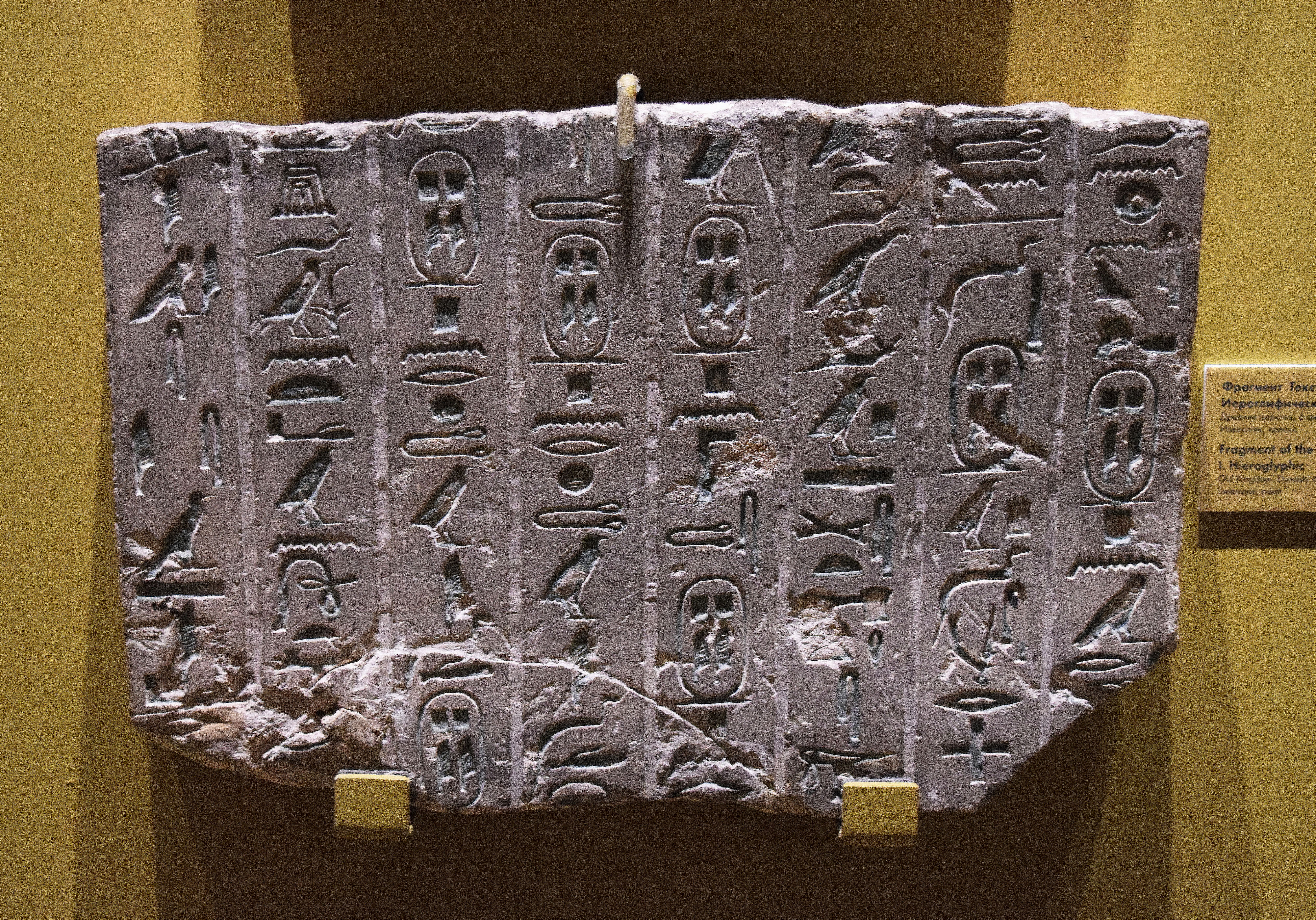 This fragment of limestone contains text in ancient Egyptian hieroglyphics that was found in the pyramid of Pharaoh Pepi I Meryre (r. c. 2335–2285 BCE). (Pushkin Museum, Moscow)