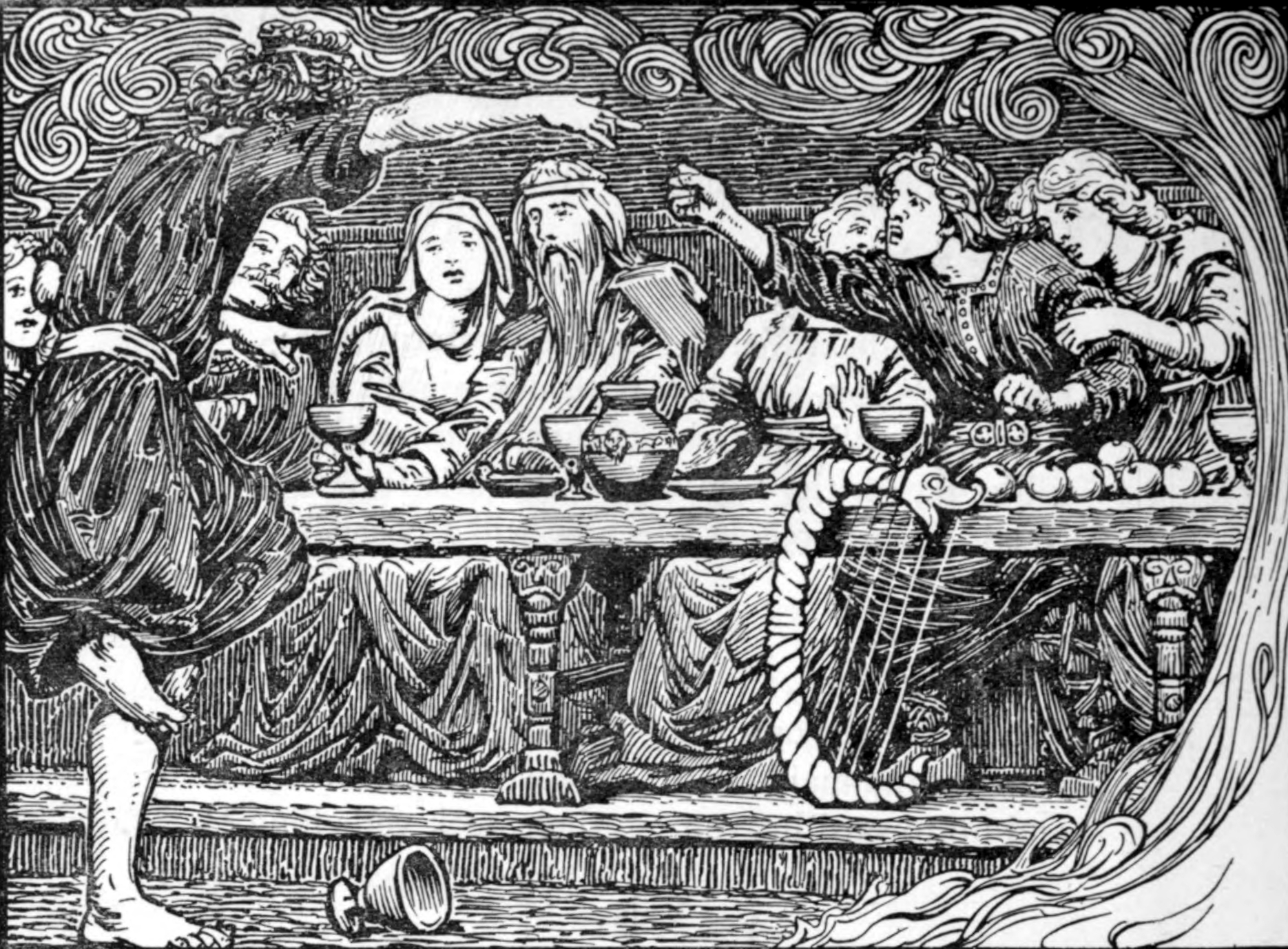 Loki taunting Bragi, a scene from Norse mythology relayed in the Lokasenna story, Illustration by W.G. Collingwood from page 244 of The Elder or Poetic Edda; commonly known as Sæmund's Edda. Edited and translated with introduction and notes by Olive Bray, 1908.