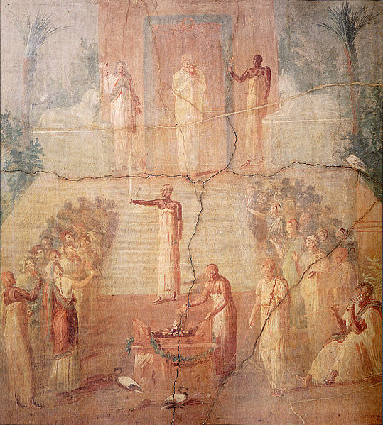 The cult of the Egyptian goddess Isis first spread to Rome during the Hellenistic period and it enjoyed popularity until the adoption of Christianity throughout the Roman Empire in the 4th century CE. This mural from a temple to Isis in Herculaneum is dated between 62 - 79 CE and depicts Isiac priests carrying out a water ritual in front of a gathering of devotees. First discovered in 1765 CE, this mural is currently part of the collection of the National Archaeological Museum of Naples, Italy.