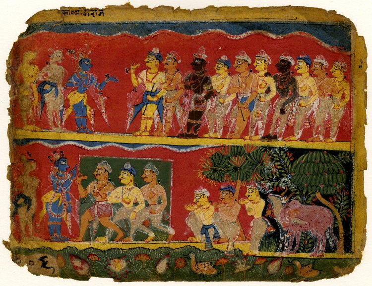 Page from a manuscript of the Bhagavata Purana. Three cowherds bring their cows to the river Yamuna to drink, then they ask Kṛṣṇa how to find food. Above, Kṛṣṇa tells a group of cowherds, all standing in a line to go and ask the brahmin ladies who were then offering Vedic sacrifices. c. 1500 CE, India