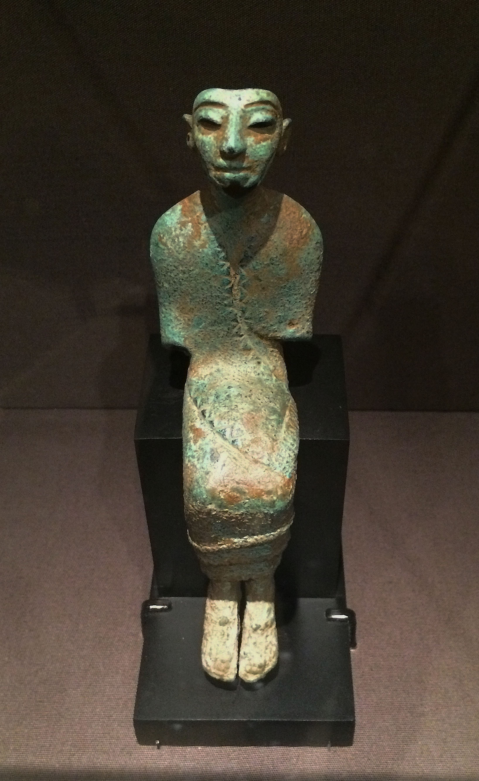 This small bronze of an enthroned god, wearing sandals and a long wrapped cloak with ribbed ornamentation near the ankles, reflects the balance between stylization and specific adornment that many modern artists like Modigliani, Picasso, and Matisse appreciated in many kinds of ancient art. It dates from the 17th-13th century BCE, and it was unearthed in what is present-day Syria. The inserted forearms are missing, but many aspects of the figure — the upward-gazing face with its Egyptianate features, the eyes and eyebrows recessed for inlay, the pieced earlobes — attest this artistic finesse of this specimen's creator. (Collection of Judy and Michael Steinhardt, New York)