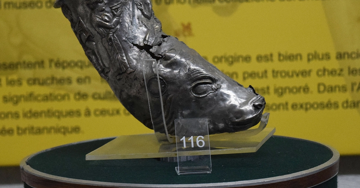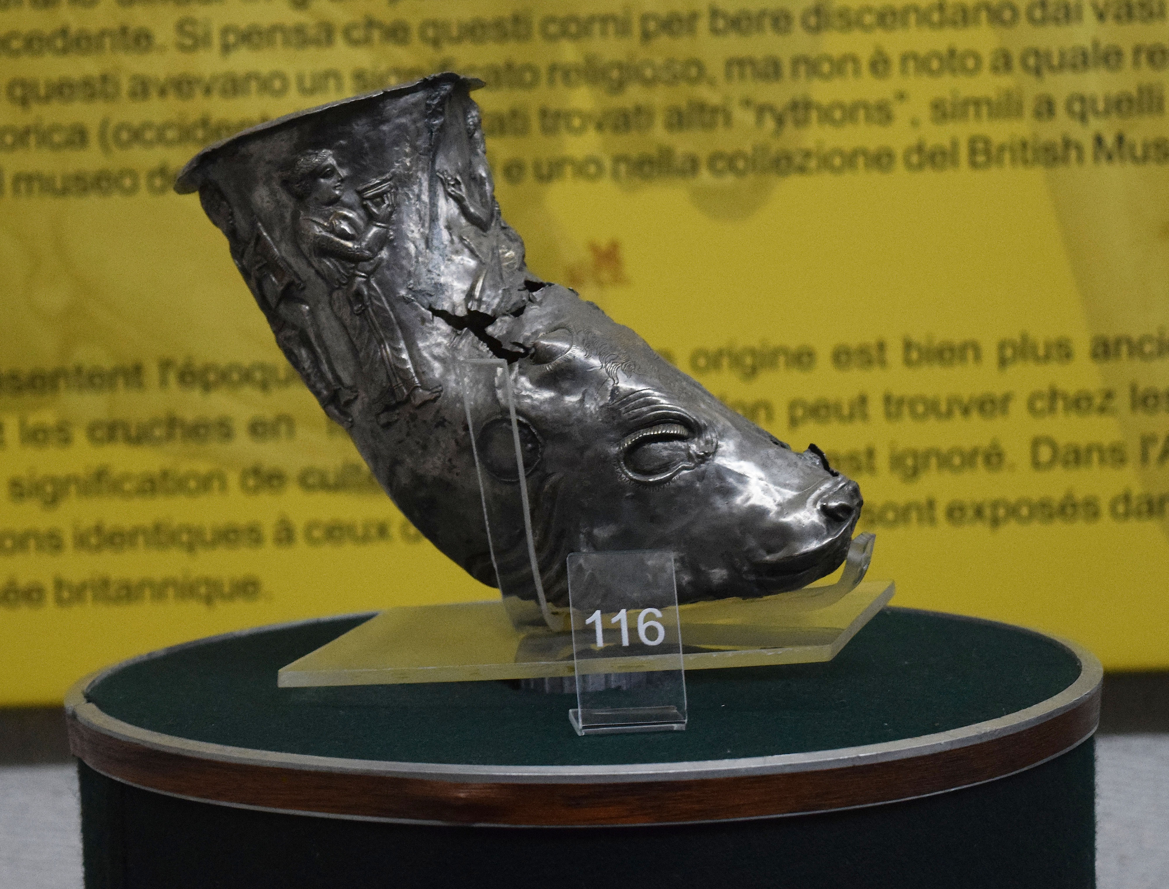 This ox head rhyton with a feast scene is from the Erebuni Fortress, which is located in what is present-day Yerevan, Armenia. It is made of silver and dates from the 4th century BCE when the Erebuni Fortress was under the control of the Achaemenid Persian Empire. (Erebuni Historical and Archaeological Preserve, Yerevan, Armenia.)