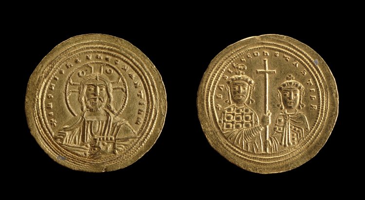 A gold nomisma coin of Byzantine emperor Basil II (r. 976-1025 CE). The obverse shows Jesus Christ (left) while Basil is depicted on the reverse (right). (British Museum, London)
