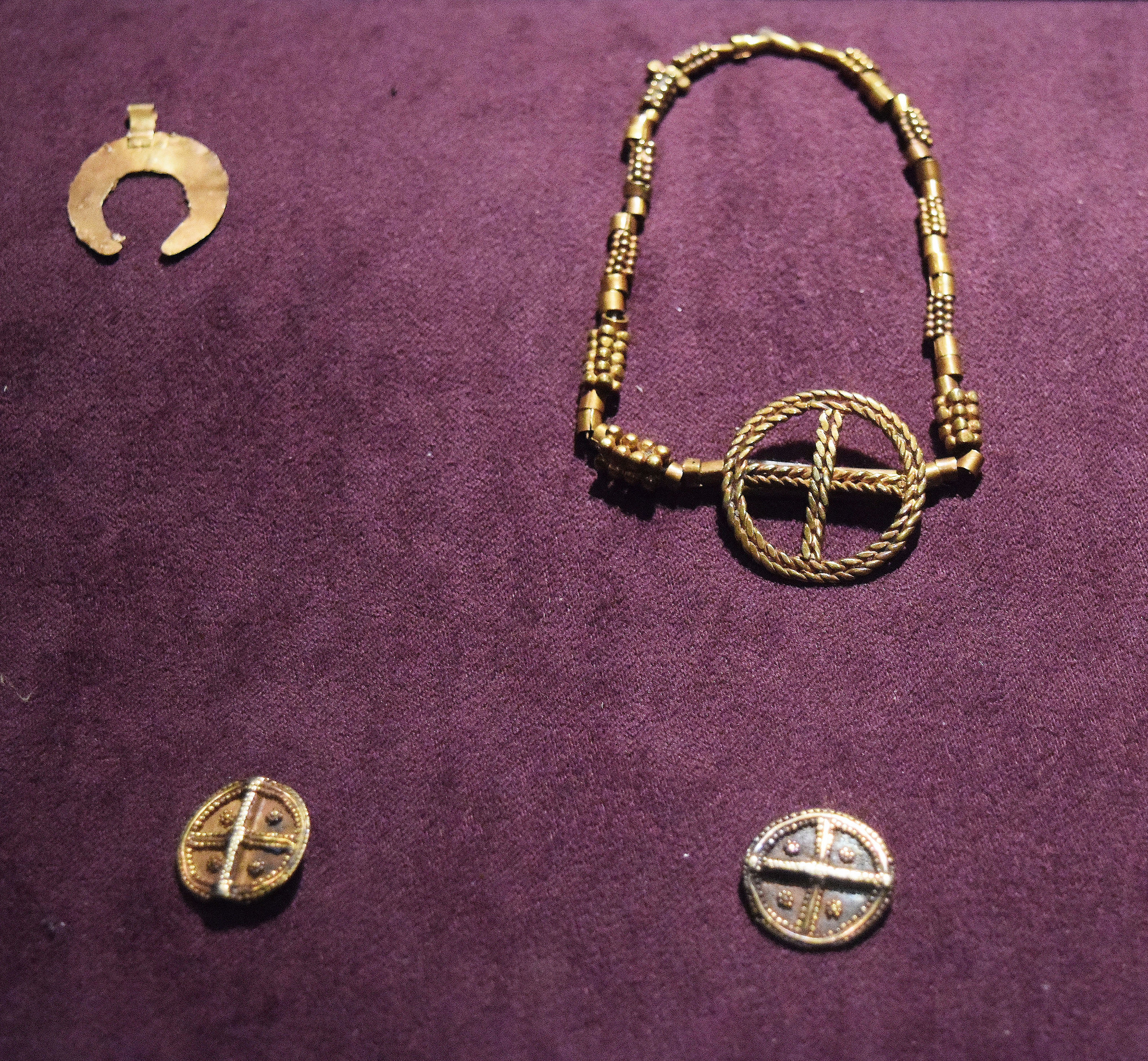This picture shows a collection of jewels and jewelry (necklaces, pendants, beads) made of gold, tin, and sardonyx. These pieces were made in the 15-13th century BCE in what is present-day Armenia. (Metsamor Historical-Archaeological Museum-Reserve, Taronik, Armenia)