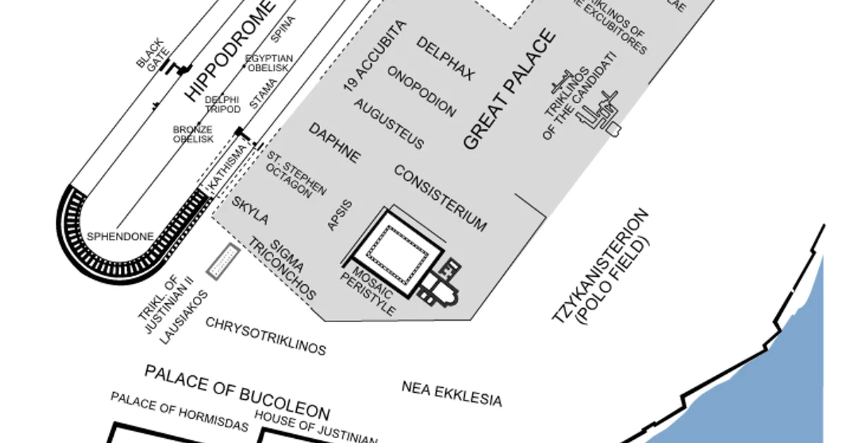 A plan showing the layout and location of the Hippodrome of Constantiople, in use from the 3rd to 13th century CE.