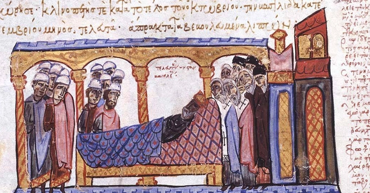 A 12th century CE illustration of Byzantine emperor Constantine VII on his deathbed (r. 945-959 CE). From the Madrid Skylitzes. (National Library, Madrid)