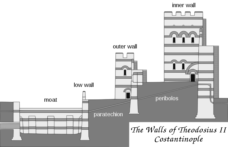 A diagram showing a cross-section of the Theodosian Walls of Constantinople, completed c. 413 CE.