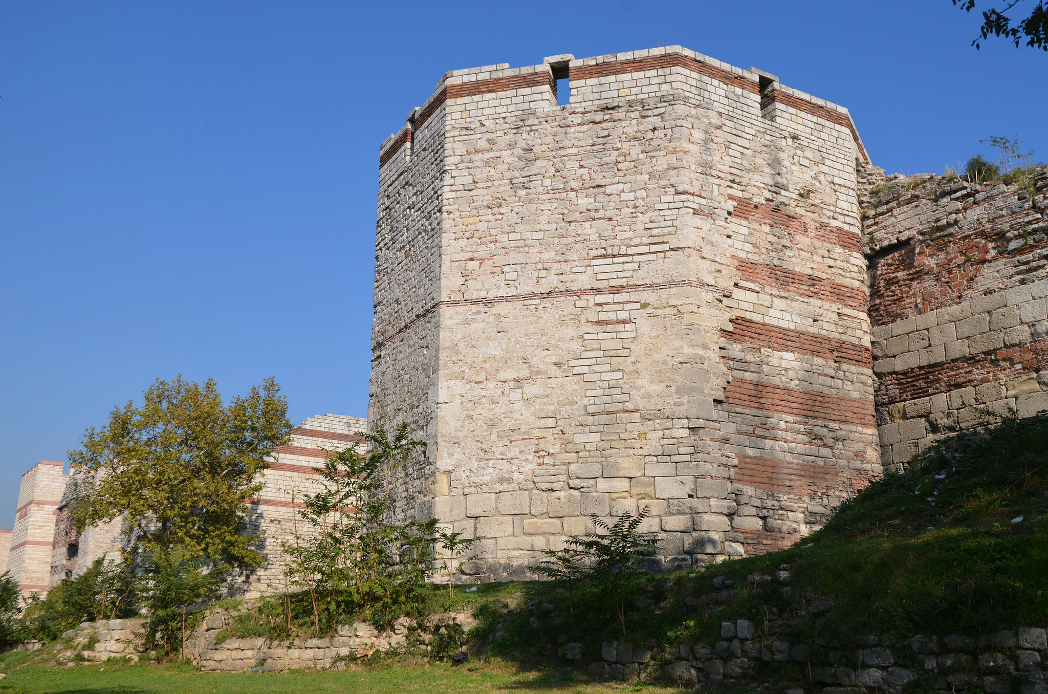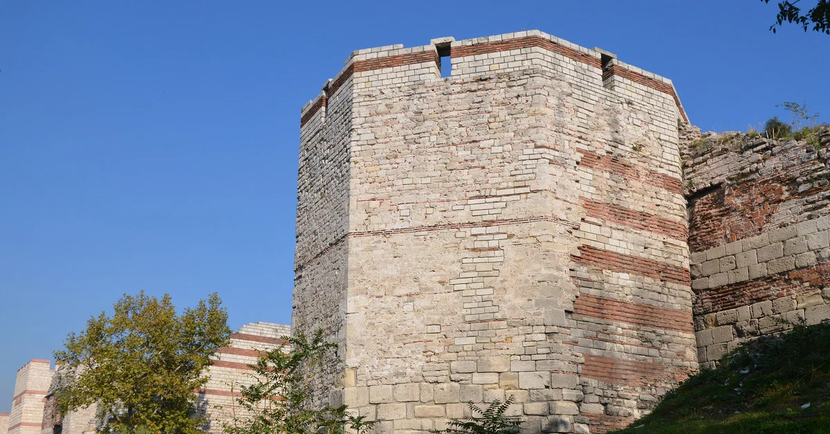 A tower and section of the Theodosian Walls of Constantinople, completed c. 413 CE.
