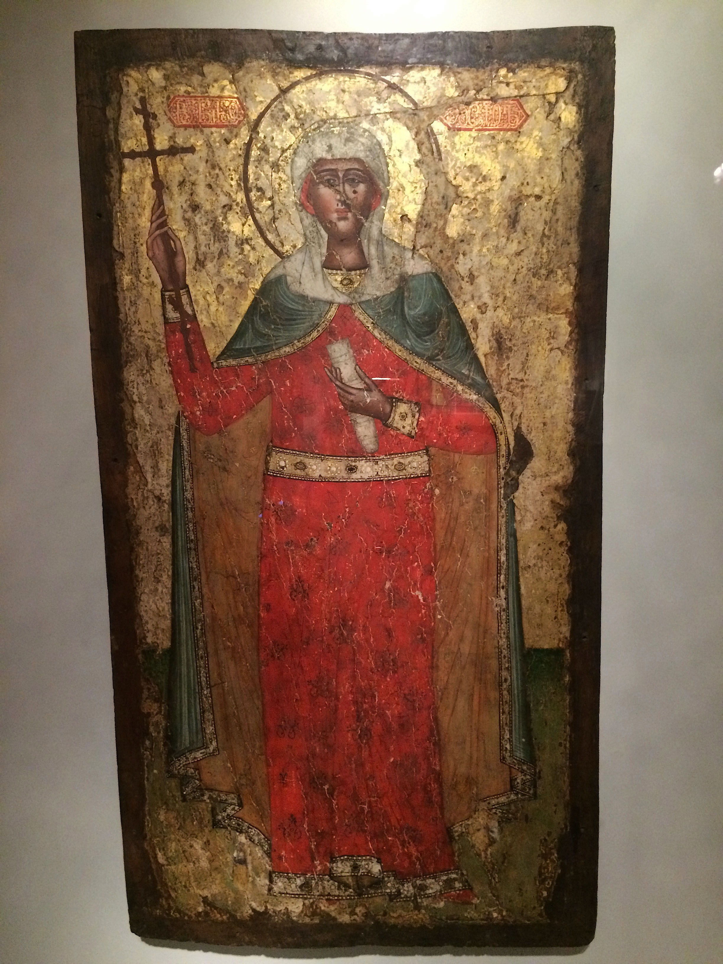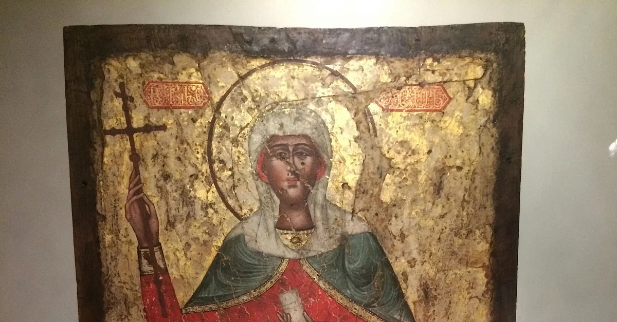 This painted icon from the Church of the Dormition of the Virgin (or Davit Aghmashenebeli Church) at Shiomghvime Monastery is dated to the Middle Ages or as late as the 17th century CE. The icon rendered in Byzantine style features Nino depicted full-length like the Virgin, the patron of Mount Athos. She holds a cross, vine shoots, and a scroll, which symbolizes preaching. An inscription in the Georgia Asomtavruli script flanks the halo of the saint and reads as "Saint Nino the Apostle." (Georgian National Museum, Tbilisi)