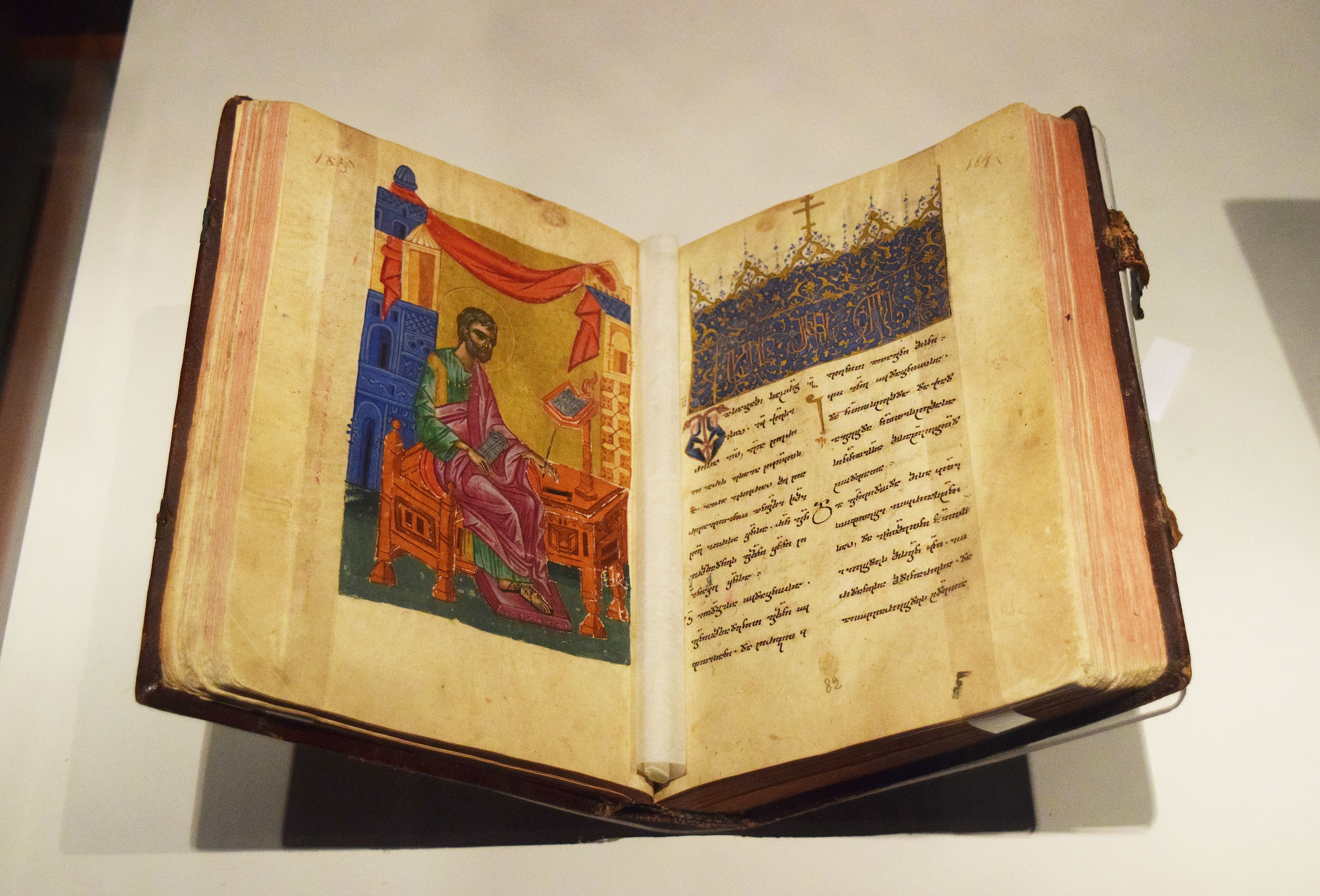 This is a festive and richly illuminated codex-type manuscript made of Persian and Italian watermarked paper. Written (or copied) in the Georgia Nuskhuri script by Zosime from Vale at Samtskhe Atabegs court scriptorium around 1514 CE, this set of gospels was commissioned by Patron Spiridon and his son Patron Ioram. Adorned with miniatures, cannon tables, and headpieces, these gospels strictly follow the traditions of the "Byzantine school." (Georgian National Museum, Tbilisi)