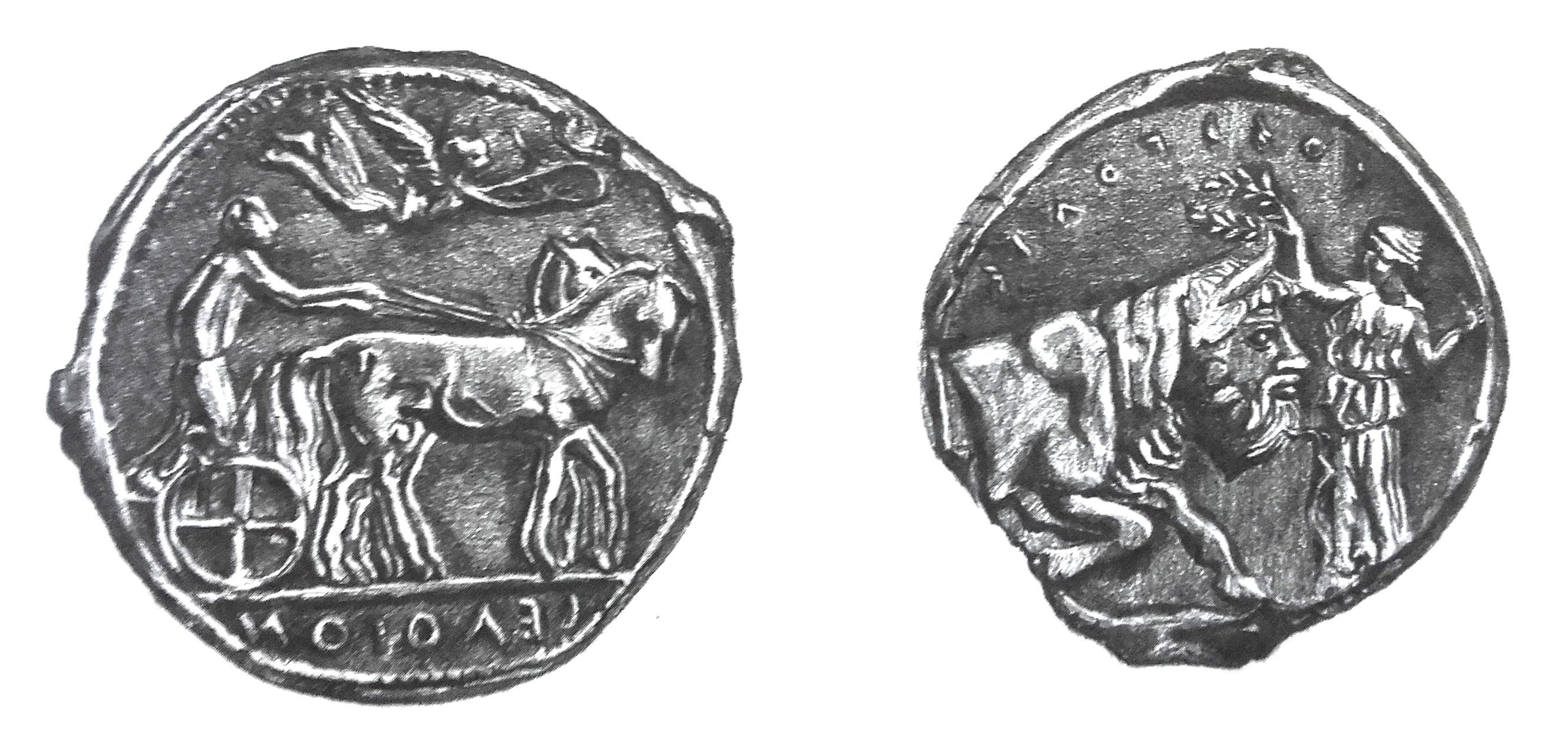 Equivalent to four drachmae, this coin is perhaps the most beautiful issued by the Gela mint, made by an unidentified engraver named as the "Master of Sosipolis" (440 BCE). The characteristic of this tetradrachm is the presence of a female figure who crowns the anthropomorphic bull (which represents the namesake river god of the city). The name "Sosipolis" is an epithet of a male deity or as a person's name. "Sosipolis" in Greek meant "saviour of the city". (Pencil drawing by Gina Pardo)