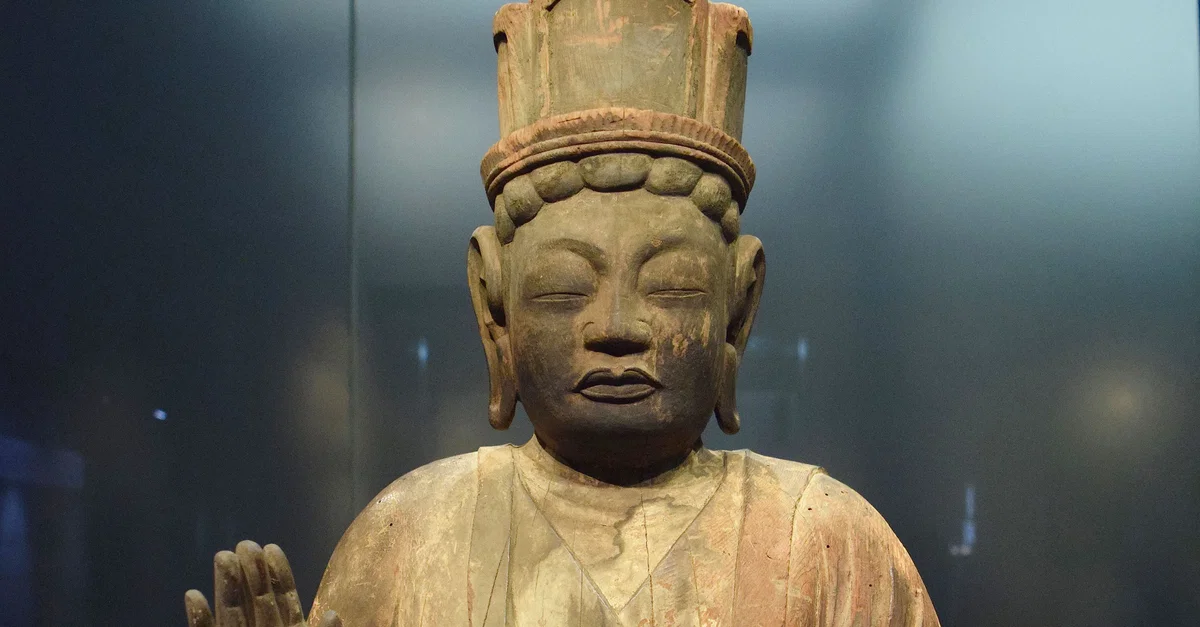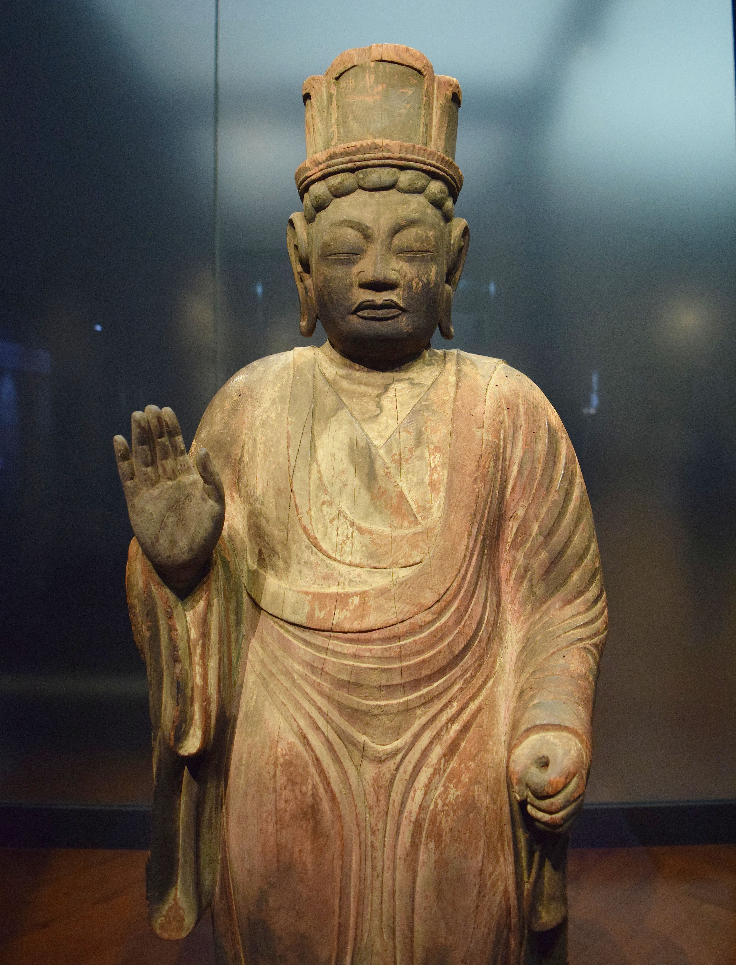 This sculpture dates from 10th-century CE Japan and is made of wood with polychrome. It depicts the deity Sakra Devanam Indra (or "Taishaku Ten" in Japanese). This deity may be traced back to Indra, a god of war in ancient India who was alted adopted into Buddhism as a protective deity. Because of these origins, he is usally shown clad in armor, although this unusual rendition is an exception. This specimen is carved from a single, soild piece of wood and characterized by flowing robers that create a "Y" shape around the waist, emphasizing the thickness of the thighs in a distinctive style that was popular in the 10th century CE. (Tokyo National Museum)