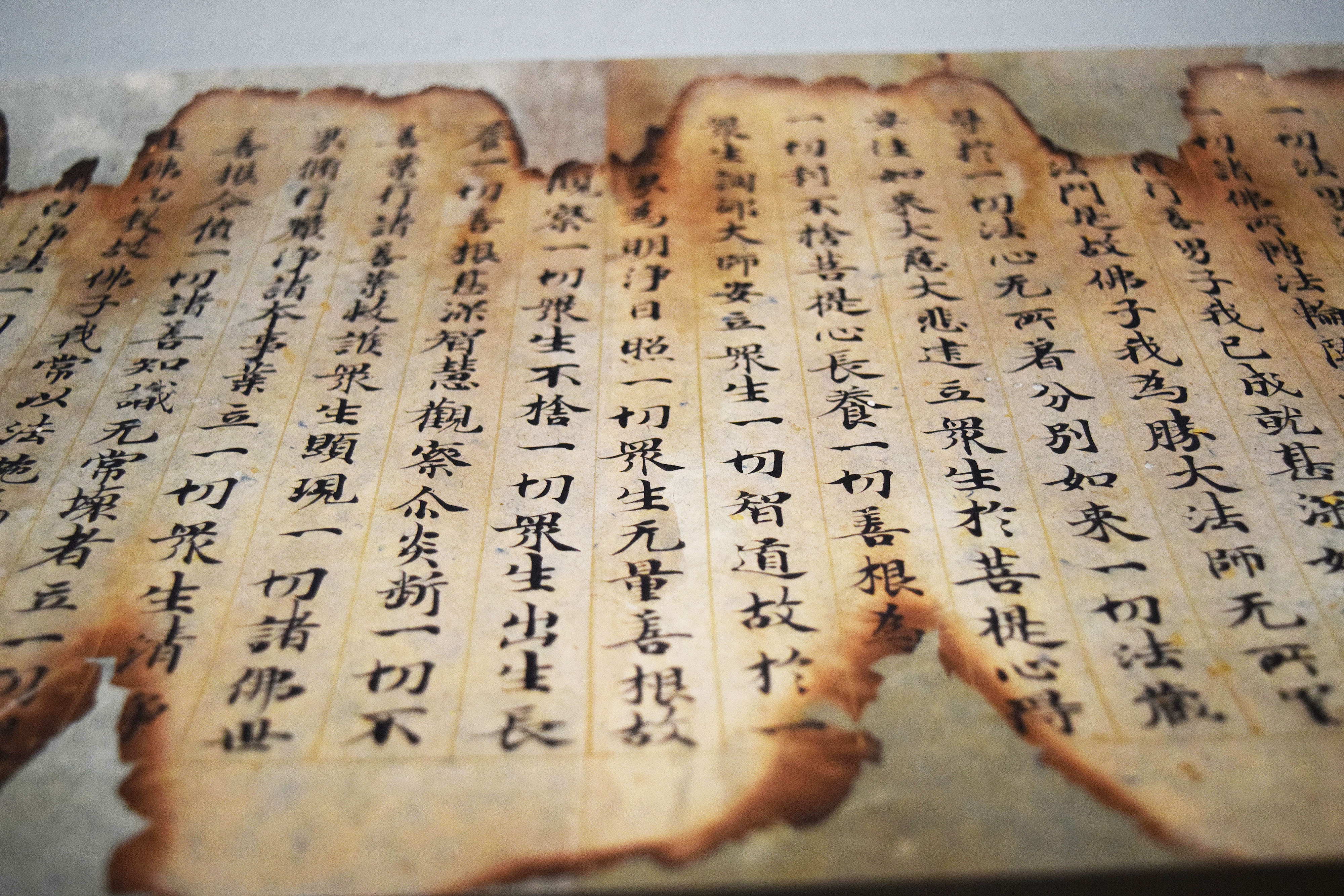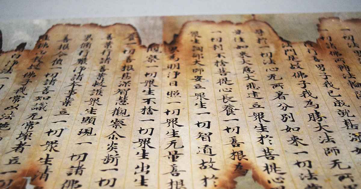 This is one of 60 scrolls from a transcription of the "Avatamsaka Sutra." Ruled lines in gold pigment segment the paper, which is decorated with flakes of god. At some point, the top and bottom of this scroll were burnt in a fire with the damage resulting in a strange visual effect when viewing the scroll today. The red seal of Senpukuji Temple is Kawachi province (now Osaka prefecture) is found at the beginning, as this is where the scroll was passed down through the ages. This sutra is made of decorated paper with ink, and it dates from 12th-century CE Japan. (Tokyo National Museum)