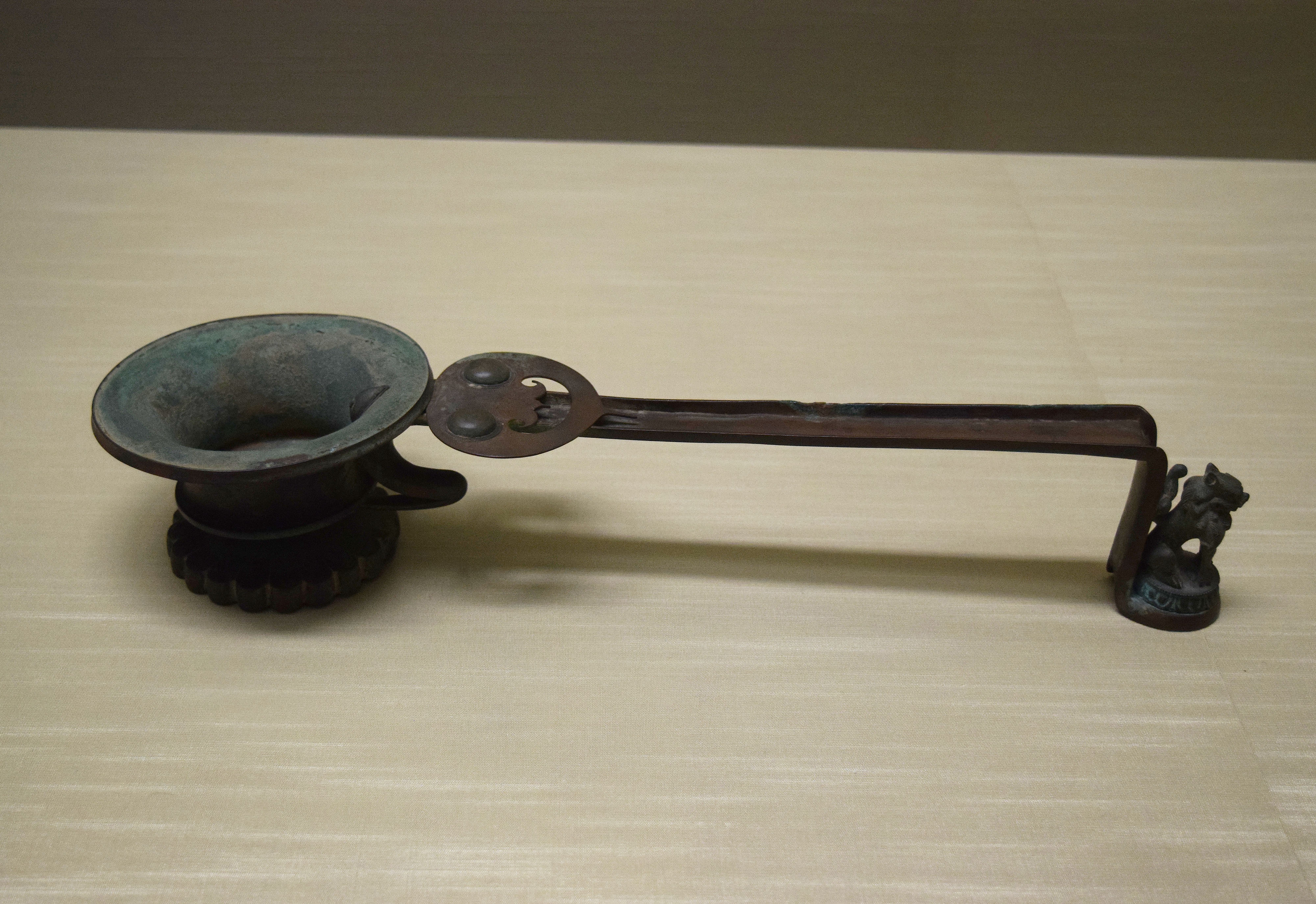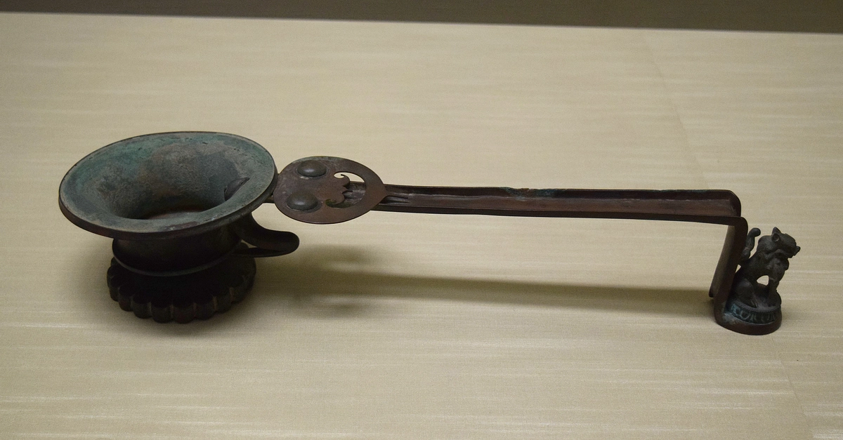 This ancient Japanese incense burner has a lion-shaped weight at the end of its handle. It was cast in bronze and dates from the 8th century CE during the Nara period in Japanese history. (Tokyo National Museum)