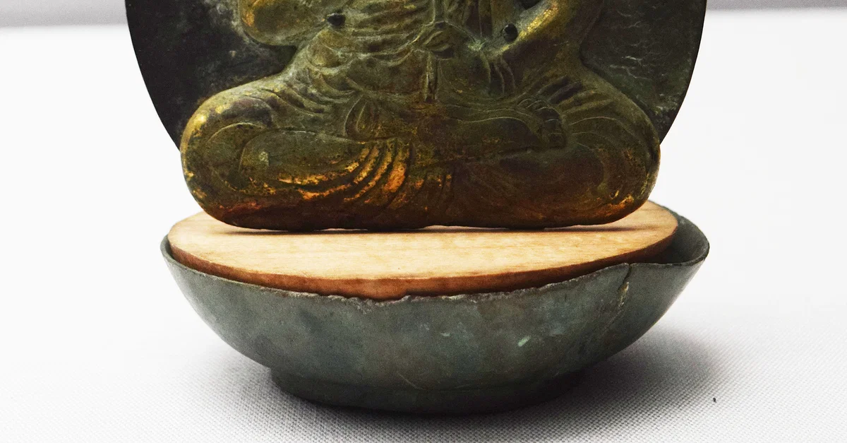 This Japanese statuette of Hoharamitsu Bosatsu dates from the 12th century CE and the Heian Period. It was excavated at Mt. Nachi in Wakayama, Japan, and it is made of gilt bronze. (Tokyo National Museum)
