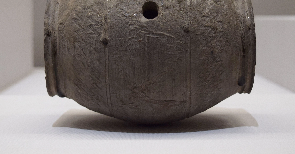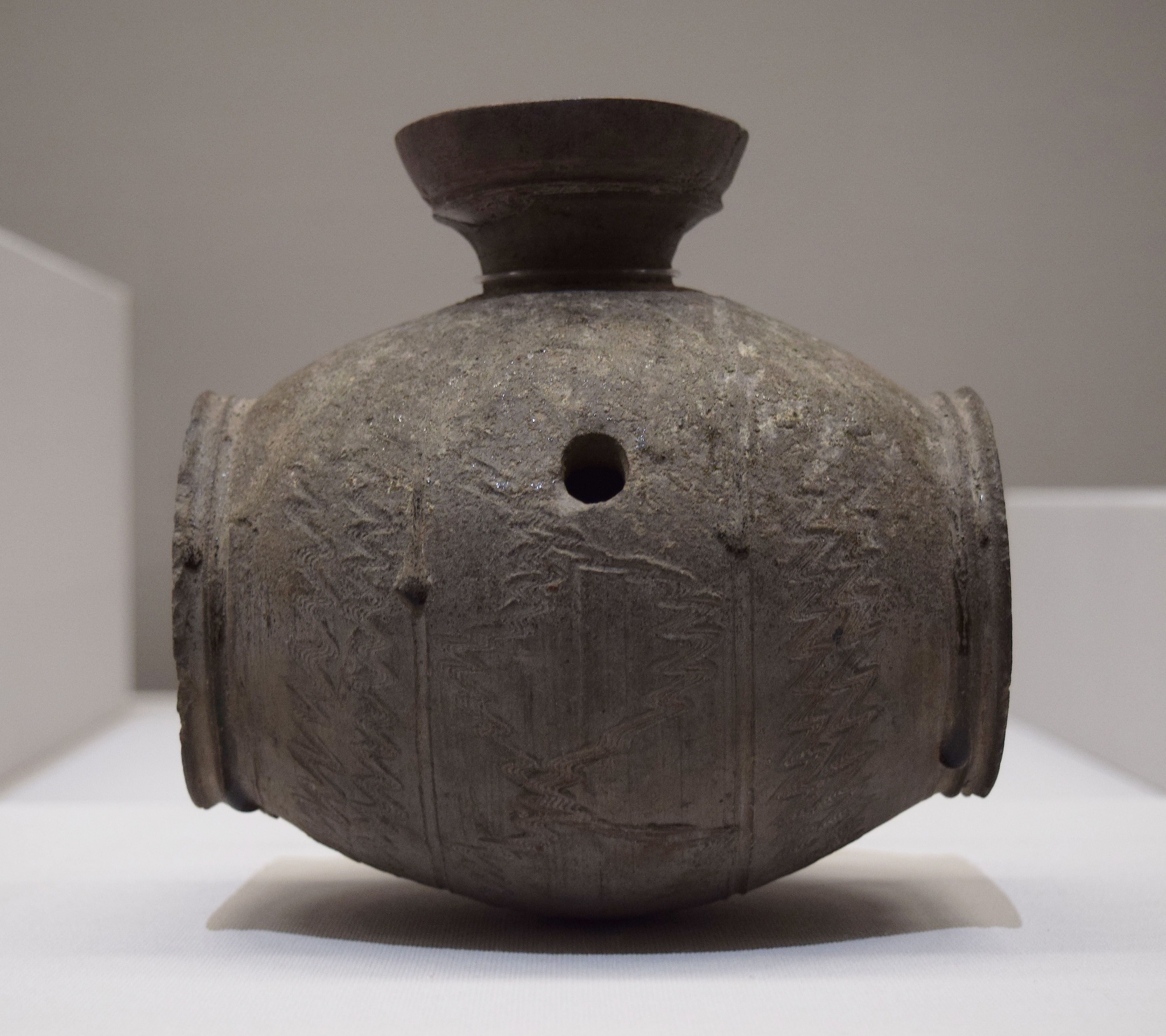 This keg-shaped pot with an opening for pouring was excavated at Enomachi, in Fukuoka prefecture, Japan. It dates from the 6th century CE or during the Kofun period. Note the curious "wave-like" designs, which might function as decor. (Tokyo National Museum)