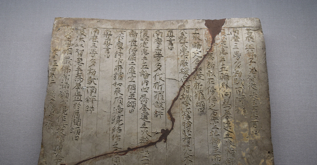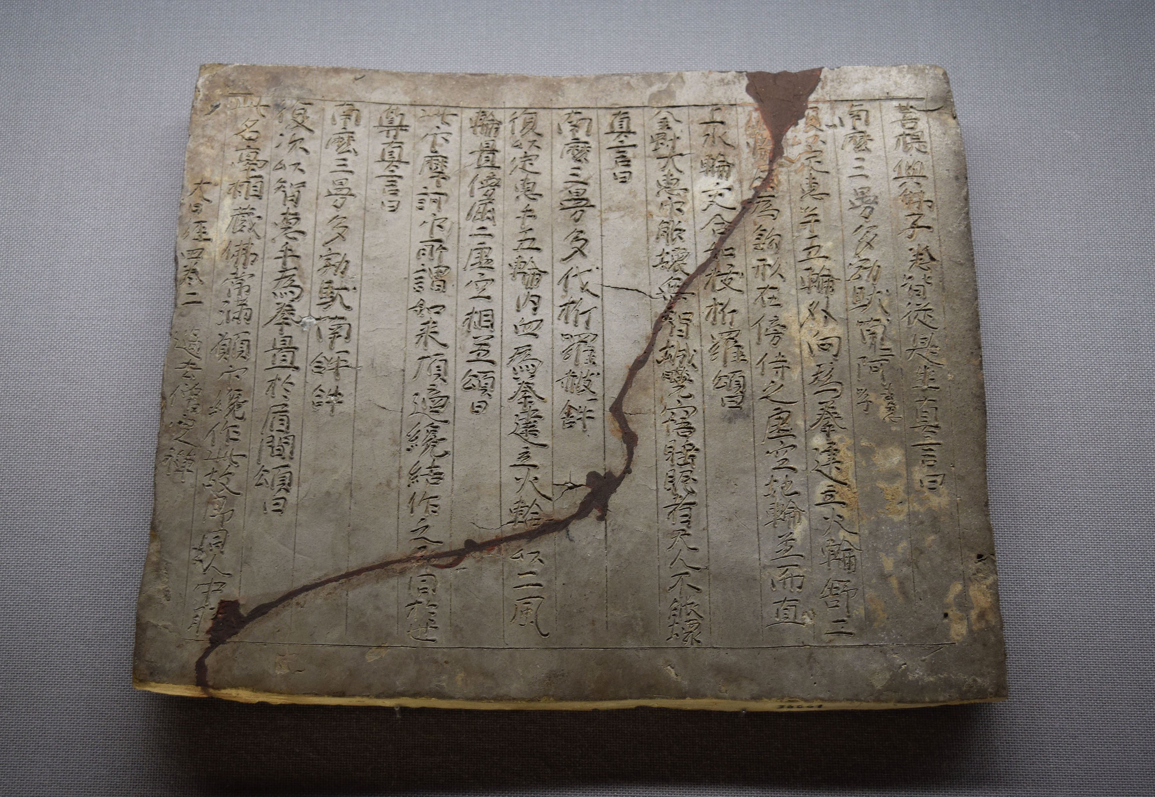 This clay tablet with sutra inscriptions was excavated at Komachizuka Sutra Mound in Tanga, which is located in Mie prefecture, Japan. It dates to 1174 CE (Jo'an 4). Important cultural property. (Tokyo National Museum)