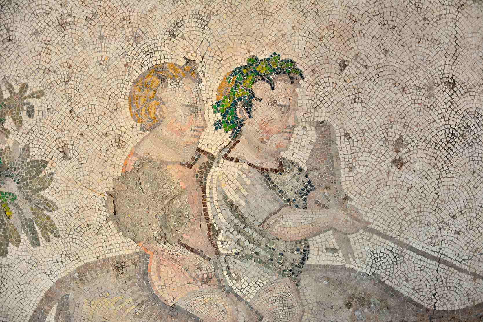 Two children are seated on a dromedary. One of them wears a wreath around his head and is holding a bird in one hand and reins with the other hand. There is also a guide in front of them. Period: Early Byzantine, c. 6th century CE. Place: Constantinople, (Modern Istanbul, Turkey). Great Palace Mosaic Museum, Istanbul, Turkey. Once located in today’s Sultan Ahmet District, the Great Palace of Constantinople was built by Constantine the Great. The Palace area extended from the Hippodrome to the coastline. Destroyed in the Nika Riot in the 6th century CE, the Great Palace was rebuilt by Justinian I. The mosaics decorating the floors of the museum today date back to that restoration time. The mosaics are just one-seventh of the original work.