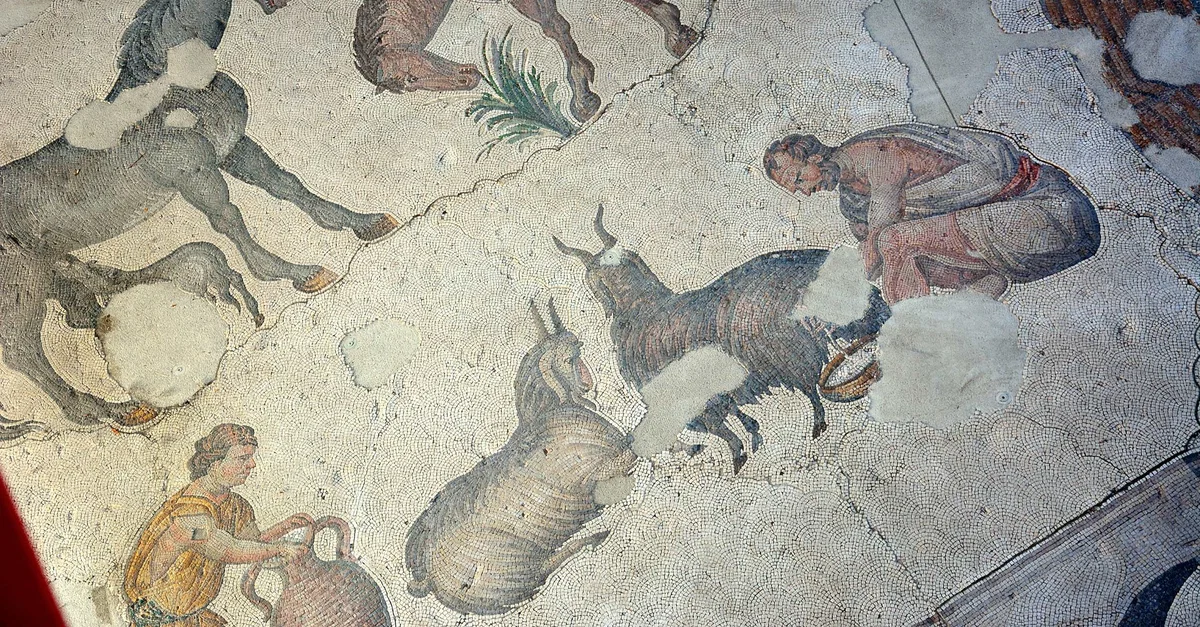 Herdsman milking a goat: An old bearded shepherd is milking his goat and a boy is holding a milk jug. This scene reflects pastoral life. Period: Early Byzantine, circa 6th. century CE. Place: Constantinople, (Modern Istanbul, Turkey). Great Palace Mosaic Museum, Istanbul, Turkey. The Great Palace Mosaic Museum was inaugurated in 1987 CE. The mosaics in the museum mostly depict animals and humans in nature, mythological, pastoral motifs and hunting scenes. Once located in today’s Sultan Ahmet District, the Great Palace of Constantinople was built by Constantine the Great. The Palace area extended from the Hippodrome to the coastline. Destroyed in the Nika Riot in the 6th century CE, the Great Palace was rebuilt by Justinian I. The mosaics, decorating the floors of the museum today date back to that restoration time. The mosaics are just one-seventh of the original work.