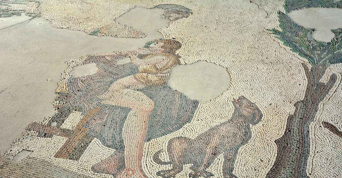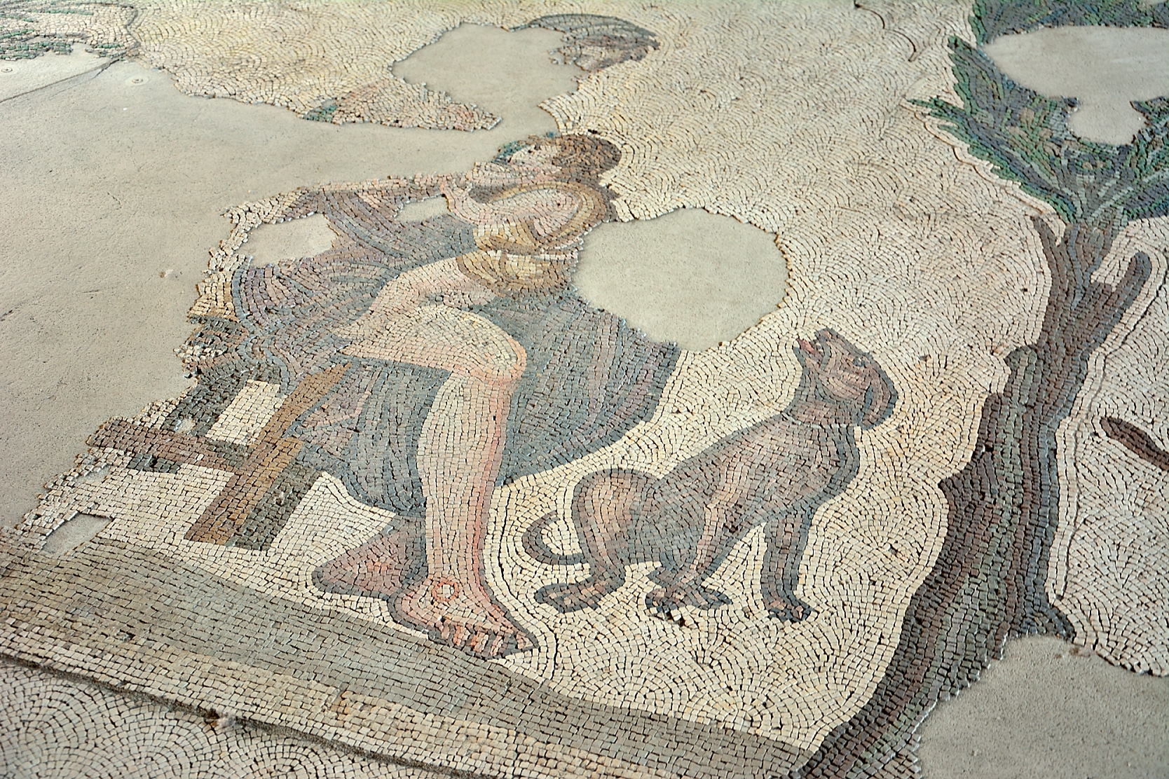 Mother and the dog: A mother is breastfeeding her baby. The scene is a representation of Isis with her child Horus. A dog on the left of the woman is looking at her with its raised head. Period: Early Byzantine, circa 6th. century CE. Place: Constantinople, (Modern Istanbul, Turkey). Great Palace Mosaic Museum, Istanbul, Turkey. The Great Palace Mosaic Museum was inaugurated in 1987 CE. The mosaics in the museum mostly depict animals and humans in nature, mythological, pastoral motifs and hunting scenes. Once located in today’s Sultan Ahmet District, the Great Palace of Constantinople was built by Constantine the Great. The Palace area extended from the Hippodrome to the coastline. Destroyed in the Nika Riot in the 6th century CE, the Great Palace was rebuilt by Justinian I. The mosaics, decorating the floors of the museum today date back to that restoration time. The mosaics are just one-seventh of the original work.
