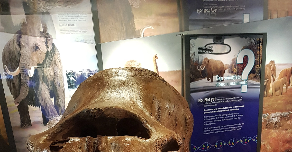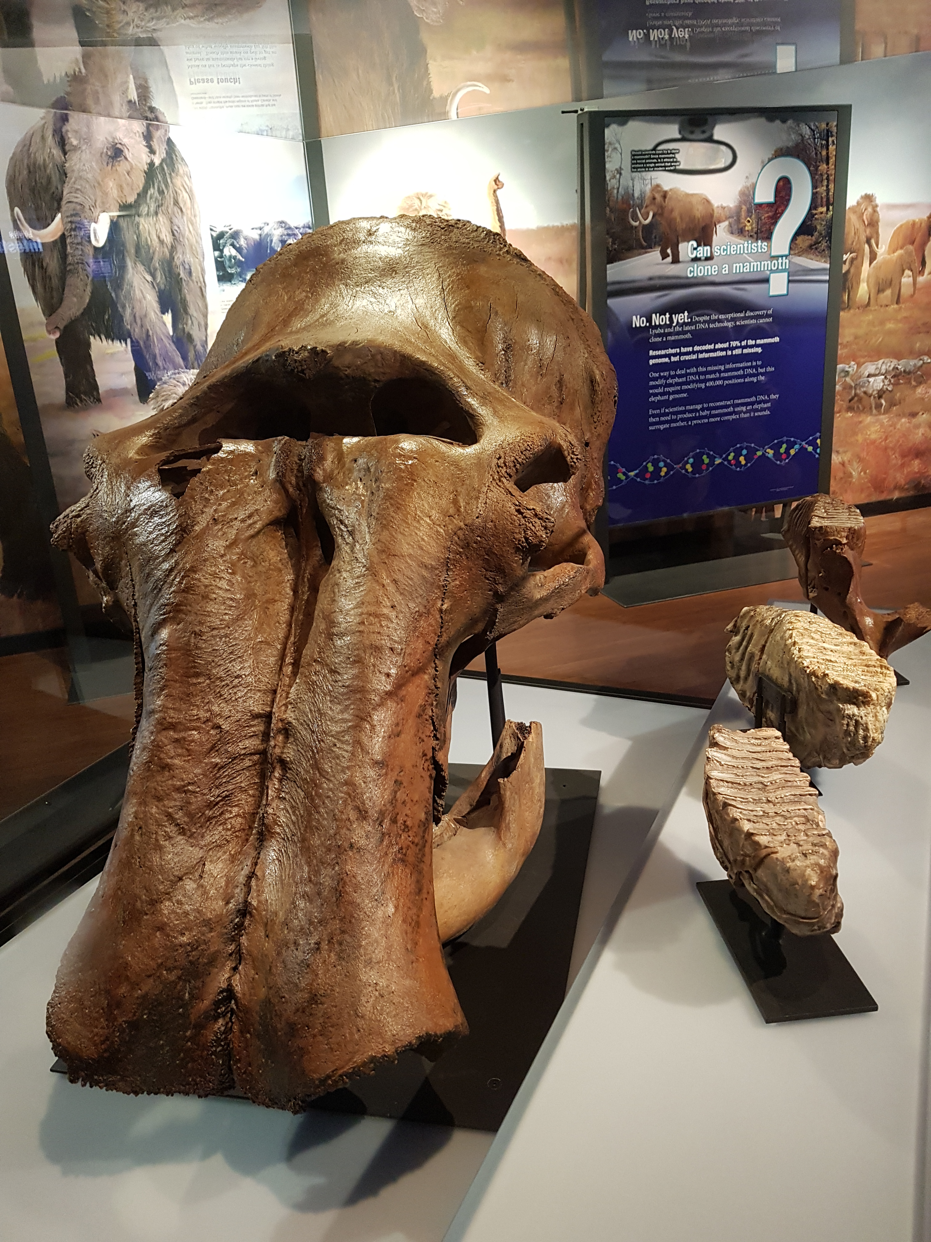 Woolly mammoth skull, jaw, and teeth (to the right) on display at the Australian Museum in Sydney in December 2017, on loan from the University of Alaska Museum in Fairbanks where it normally resides.