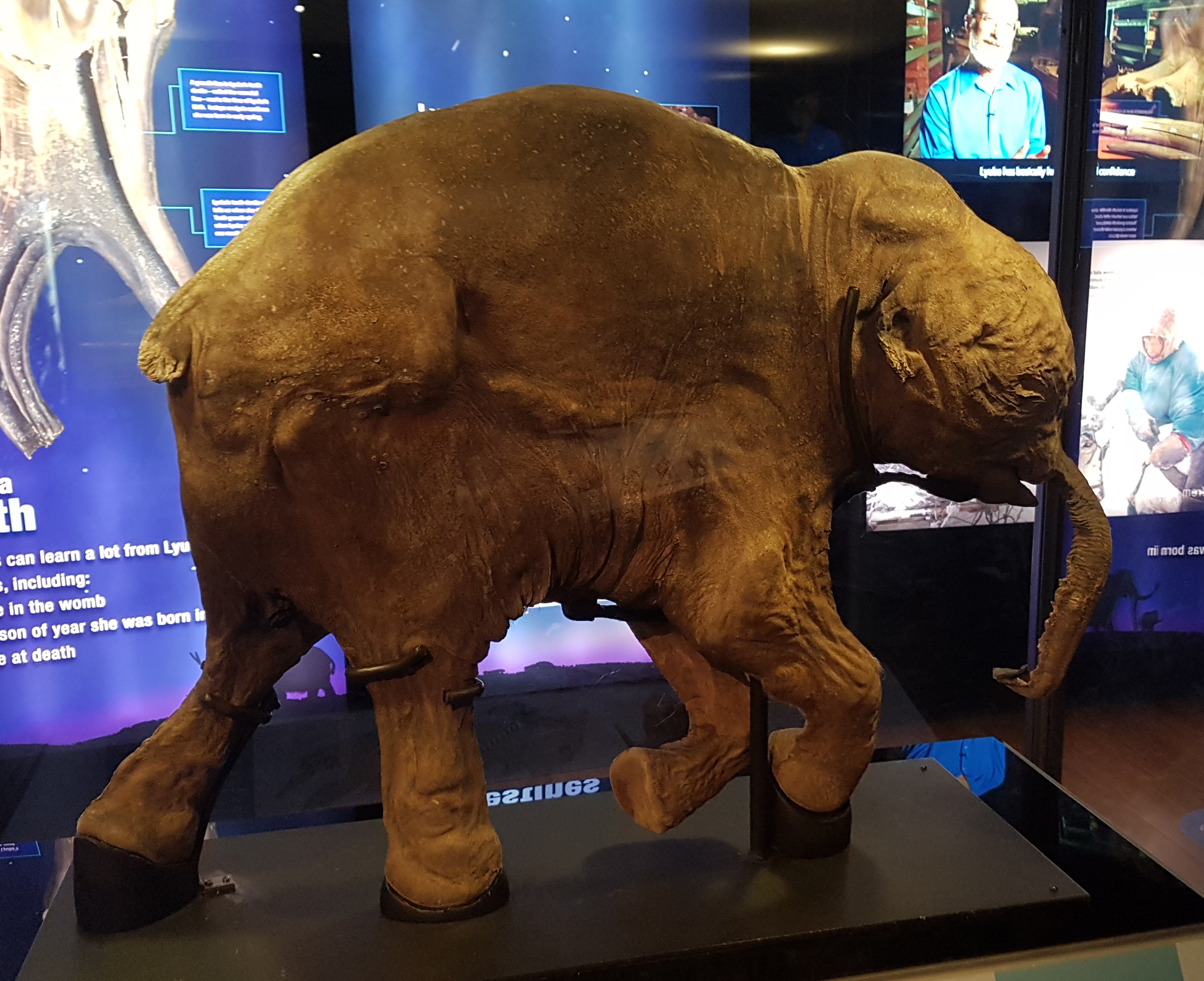 Remains of the woolly mammoth calf nicknamed 'Lyuba' (Russian for 'love') discovered in the Yamal peninsula in Russia in 2007. Lyuba - a female - was only about a month old at the time of her death, c. 42,000 years ago. She is the most complete mammoth specimen ever found to date. Normally residing at the Shemanovskiy Museum and Exhibition Center in Russia, Lyuba was on loan at the Australian Museum in Sydney in December 2017 when (and where) this photo was taken.
