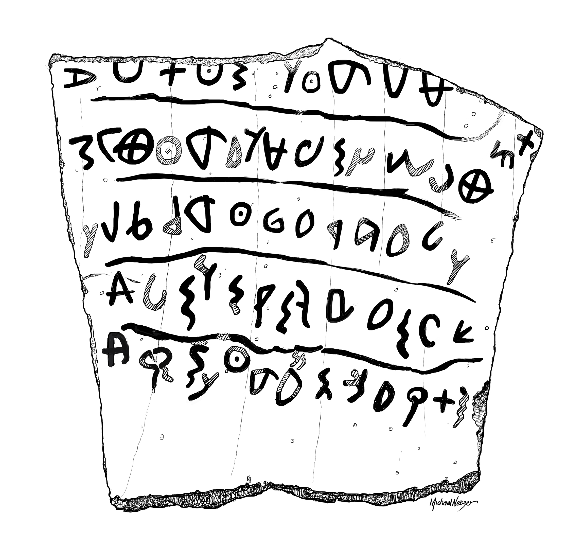 An illustration showing the markings of an ostracon (pottery sherd) from Khirbet Qeiyafa, Israel. The sherd is cited as evidence that the Hebrew language was in use from the 10th century BCE. The text has been interpreted as a social statement which concerns slaves, widows and orphans, although other interpretations have been posited. (Israel Museum, Jerusalem)