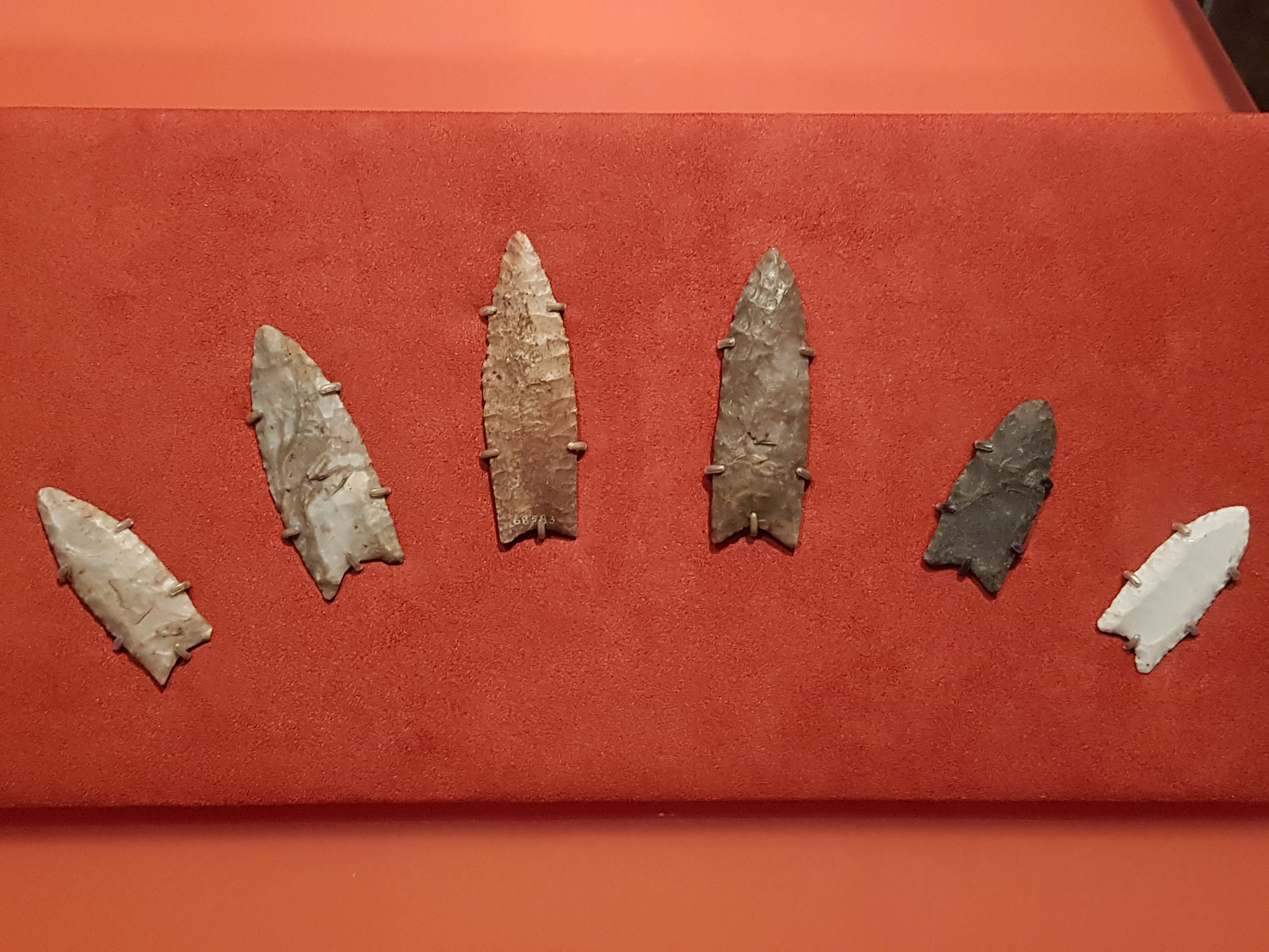 Stone spear points belonging to the Clovis industry which is associated with early modern humans (Homo sapiens) in North America between roughly 13,500-13,000 years ago. The so-called 'Clovis point' has a distinctively fluted shape (the thin groove at the base of the points) which appears to have made it stronger. These points reside at the Field Museum in Chicago but were on loan at the Australian Museum in Sydney in December 2017 when this picture was taken.