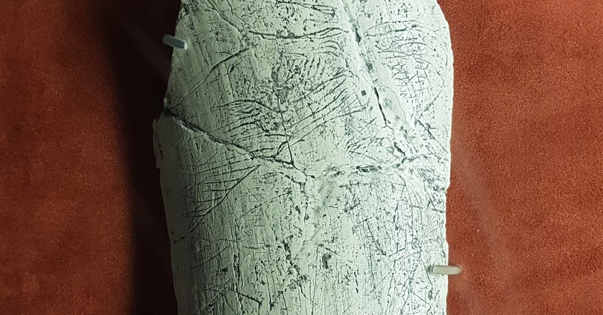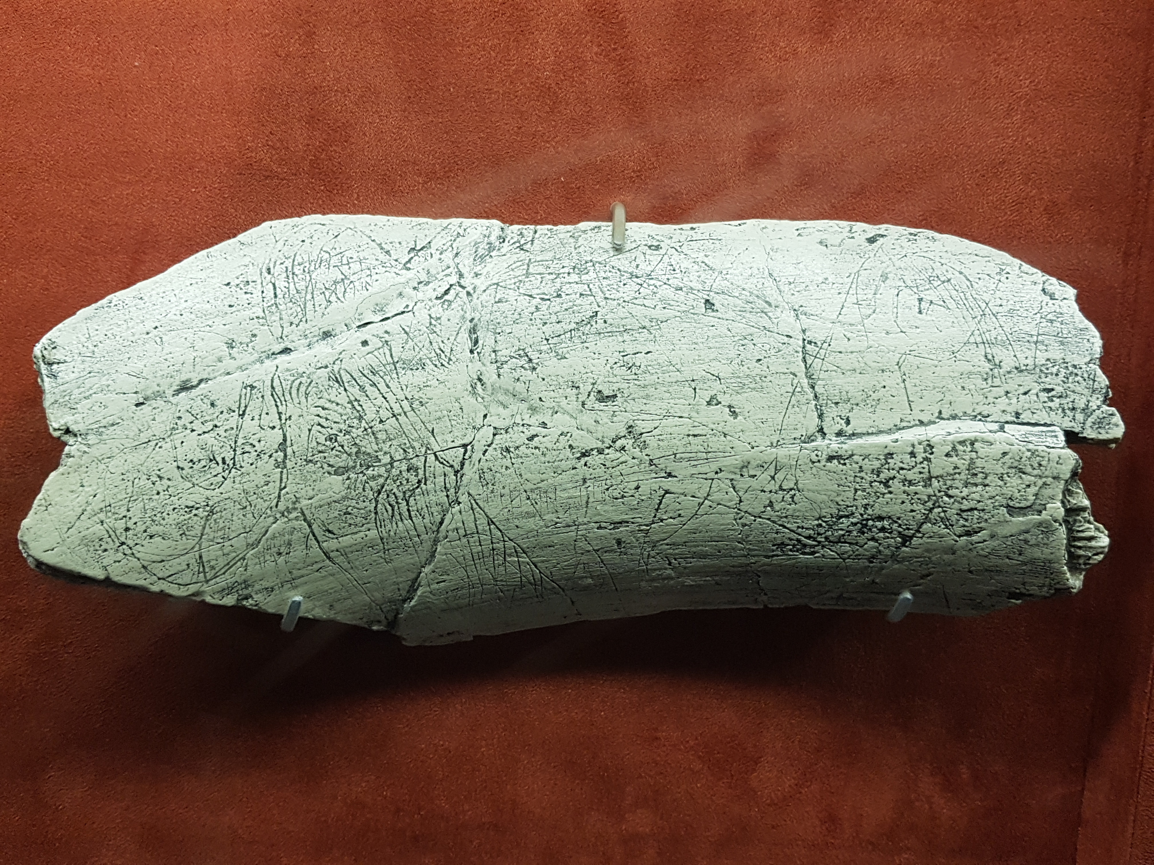 Cast of an engraving of a woolly mammoth on mammoth ivory made by early modern humans (Homo sapiens) at the rock shelter of La Madeleine, France, between c. 17,000- c. 11,000 years ago. It resides at the Collection de Paleontologie du Museum national d'Histoire naturelle in Paris, France, but was on loan at the Australian Museum in Sydney when this picture was taken in December 2017. The info provided there regarding this engraving was the following: 'While exploring the rock shelter of La Madeleine in the 1860s, prehistorian Eduoard Lartet found this mammoth ivory plaque shattered in five pieces. Upon placing the pieces back together, he noticed an engraving of a mammoth. It was one of the first artifacts to confirm that humans and mammoths had lived together during prehistory.