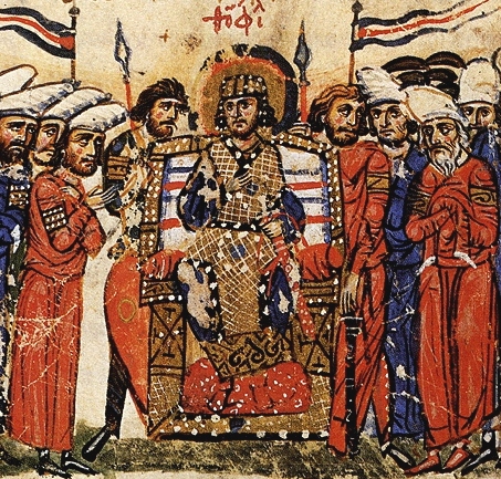 An illustration from a 12th century CE manuscript depicting the coronation of Byzantine emperor Theophilos, r. 829-842 CE. (Madrid Skylitzes, National Library, Madrid)