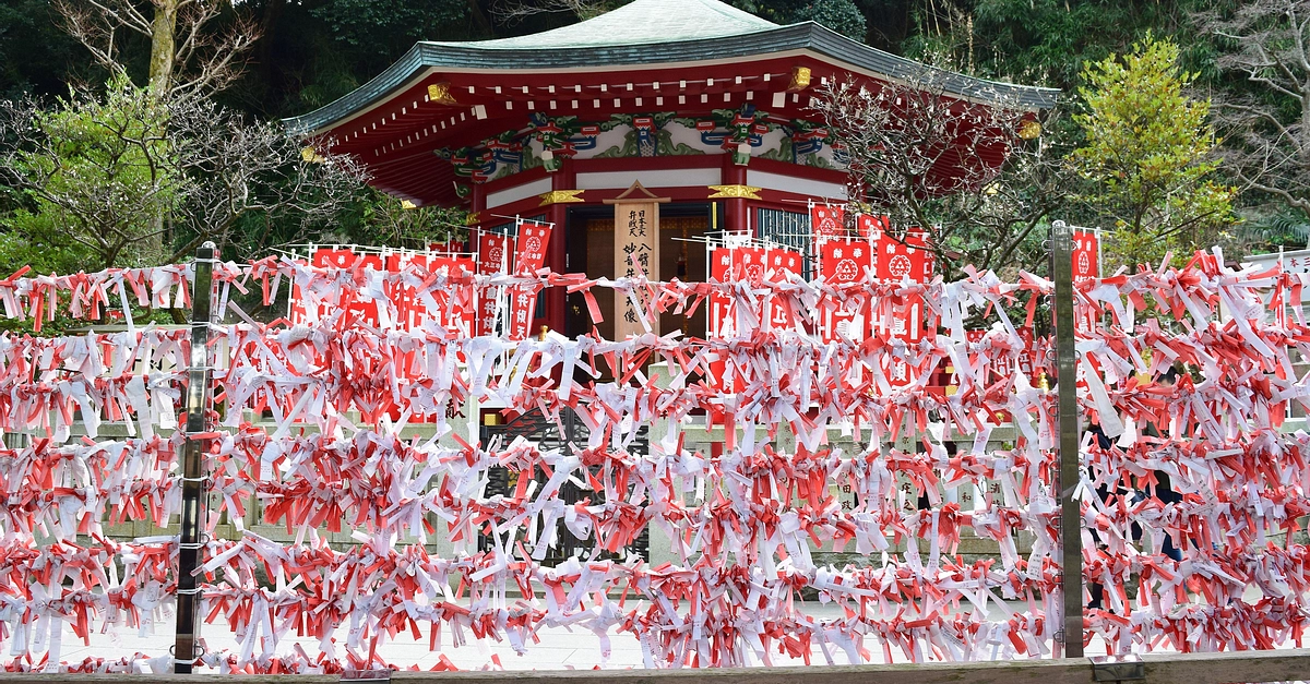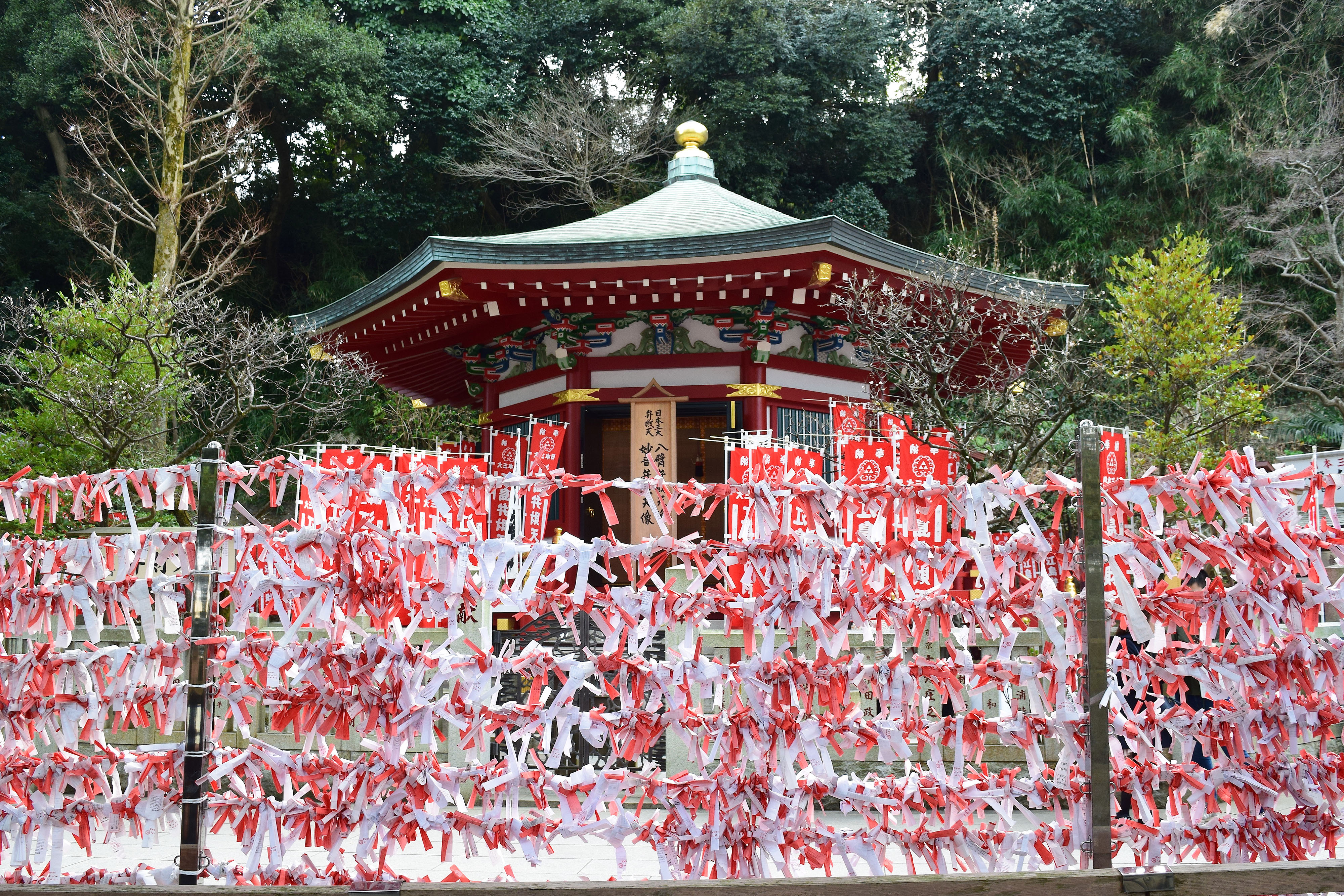 Enoshima is a Japanese island off the coast of Kanagawa Prefecture in the Pacific Ocean. It’s well-known for its colorful shrines with statues honoring the Buddhist goddess Benzaiten. In this picture, one sees the Hoanden (or the Octagonal Hall for the Statues).