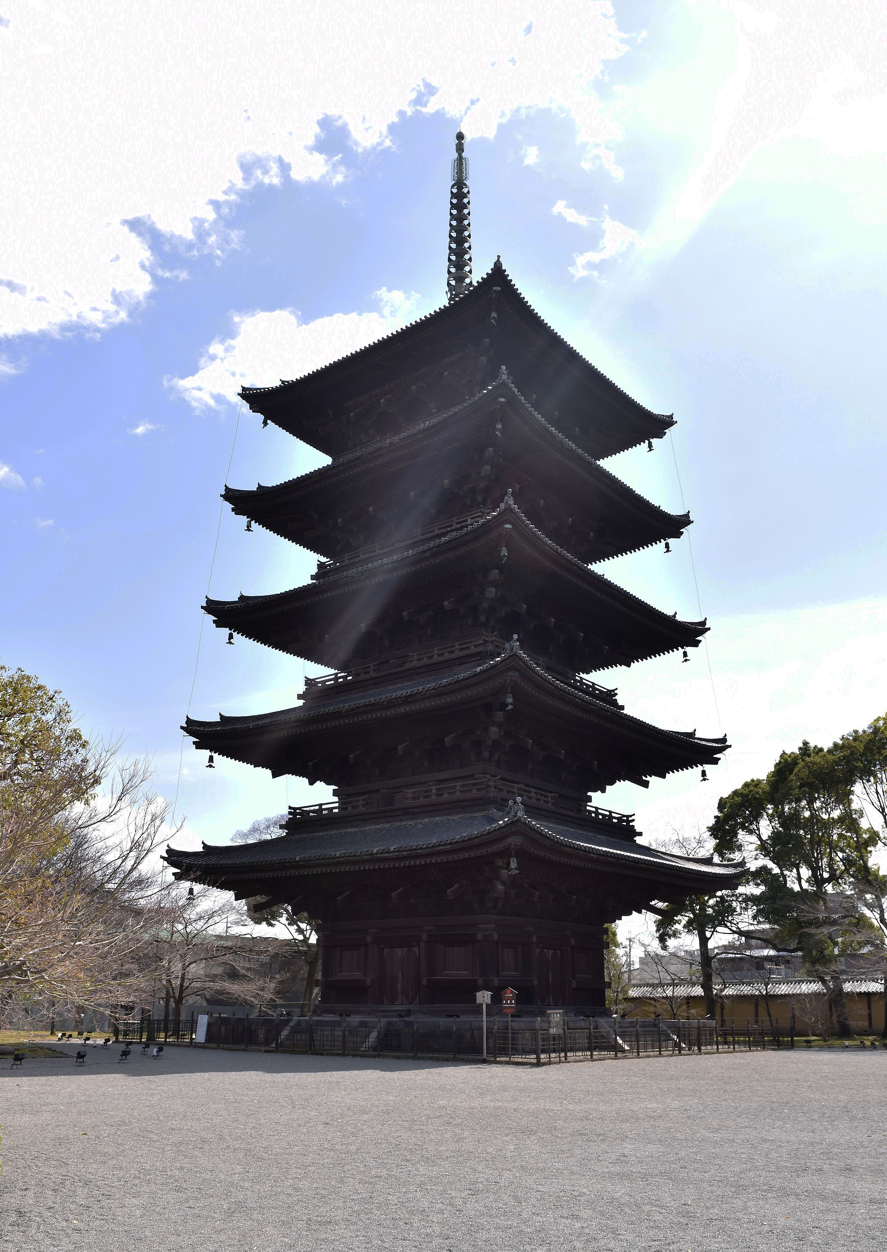 The Toji temple was first built between 794-796 CE by decree of Emperor Kammu (r. 781-806 CE) in Kyoto, Japan. The temple complex contains a five-story pagoda, which stands 54.8 m (180 ft) high. It is the tallest wooden pagoda in Japan. Access inside the pagoda is restricted to only a few days per year.