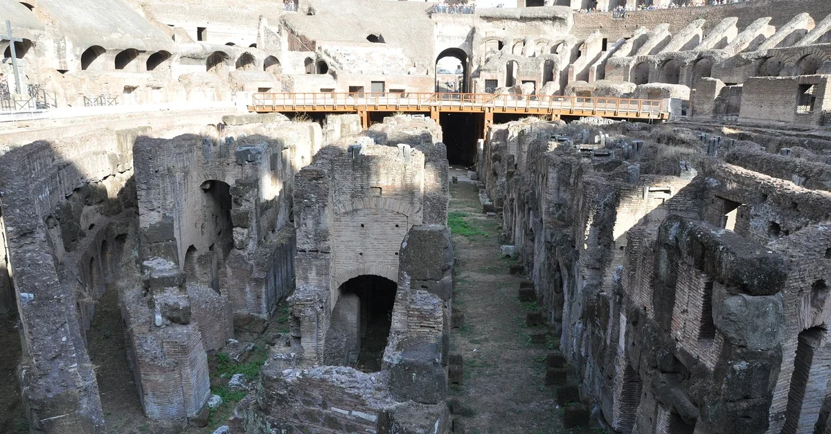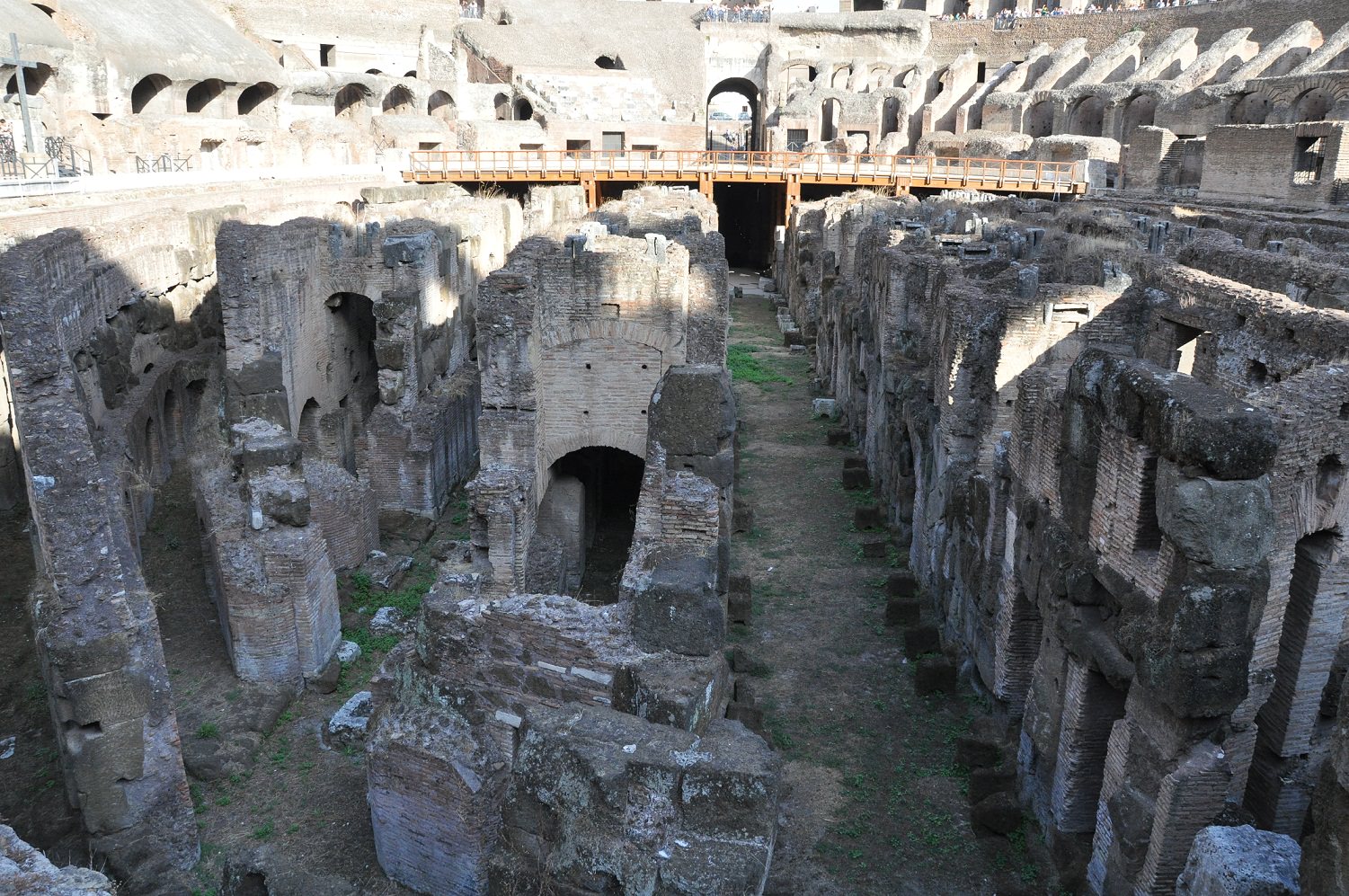 View of the underground rooms of the Colosseum. The Flavian amphitheater, built between 72 and 80 AD, has two floors built below the cavea, using what was perhaps the pond of Nero.