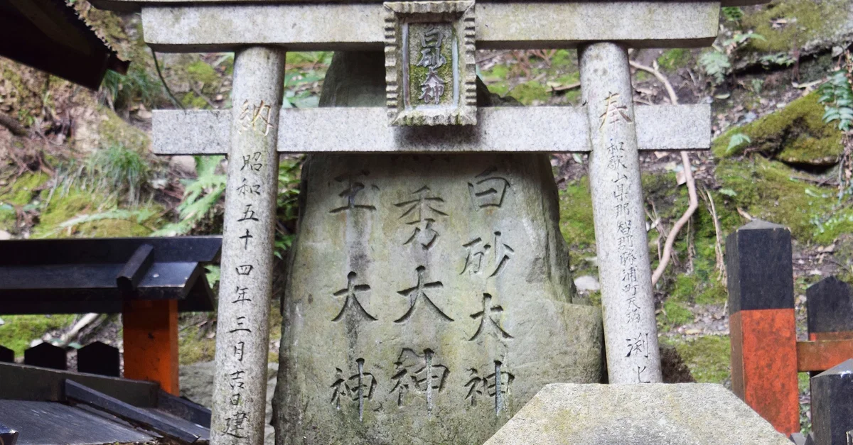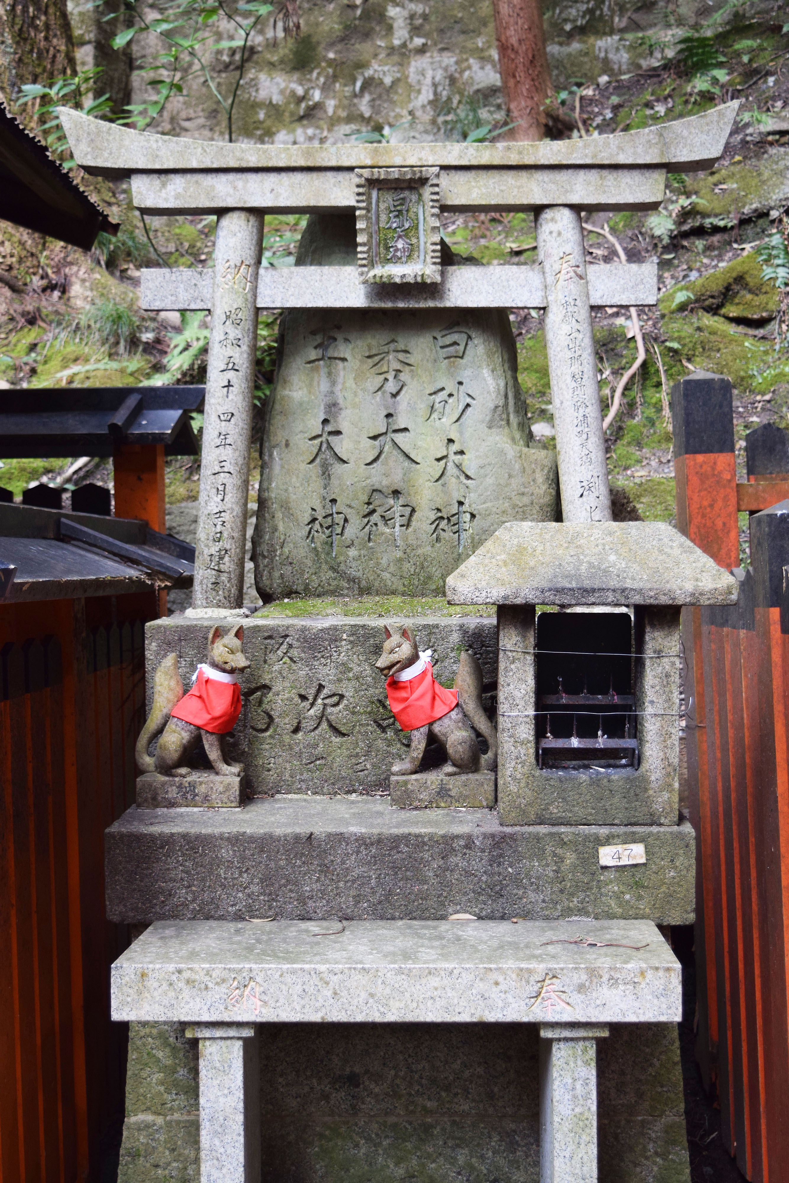 This is a miniature altar at the Fushimi Inari-taisha Shrine in Kyoto, Japan dedicated to the fox god Inari.