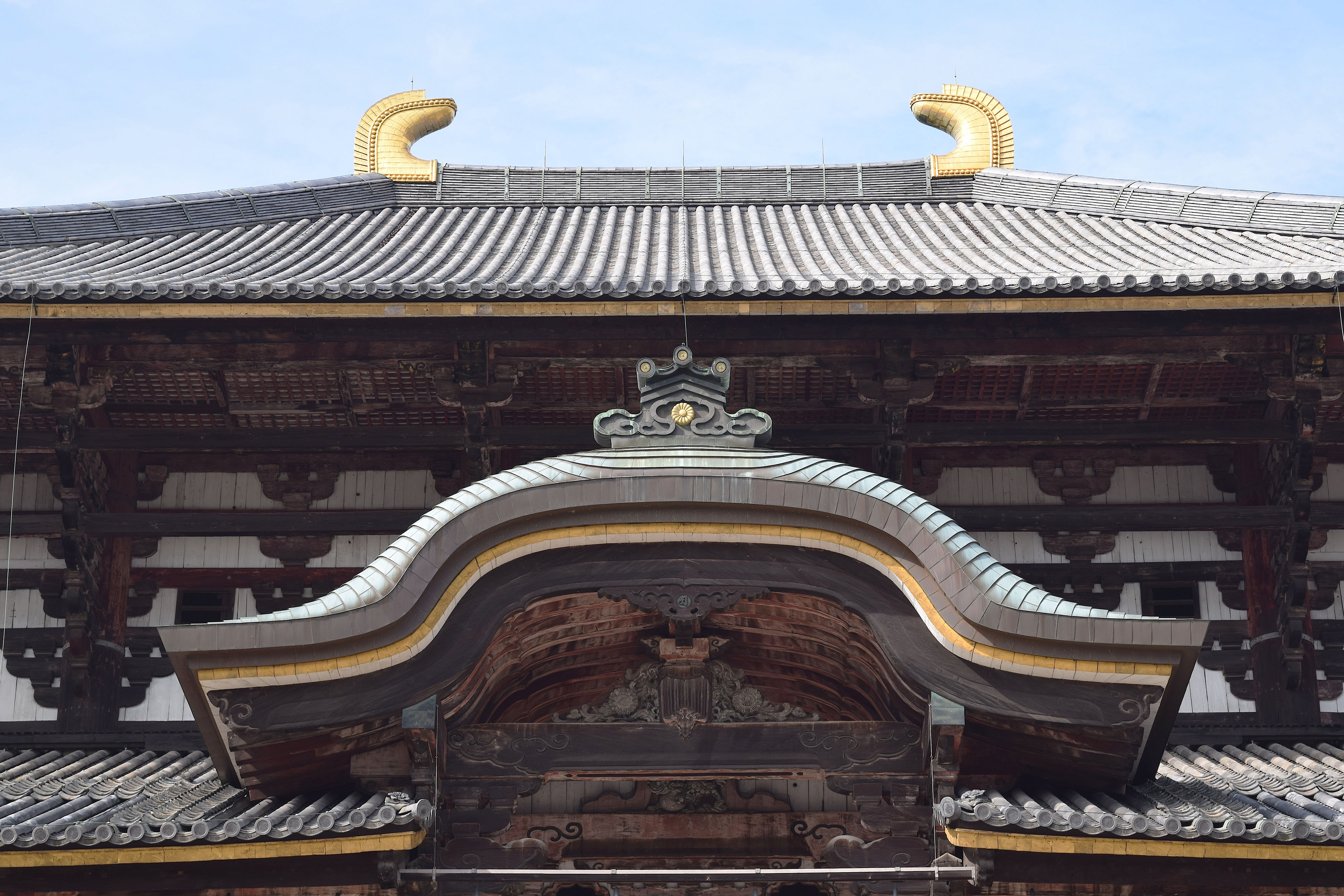 This is the ornate roof of the Daibutsuden or Great Buddha Hall of the Todaiji Temple Complex in Nara, Japan. Founded in 738 CE and officially opened in 752 CE when Nara was the capital, the temple is the headquarters of the Buddhist Kegon sect.