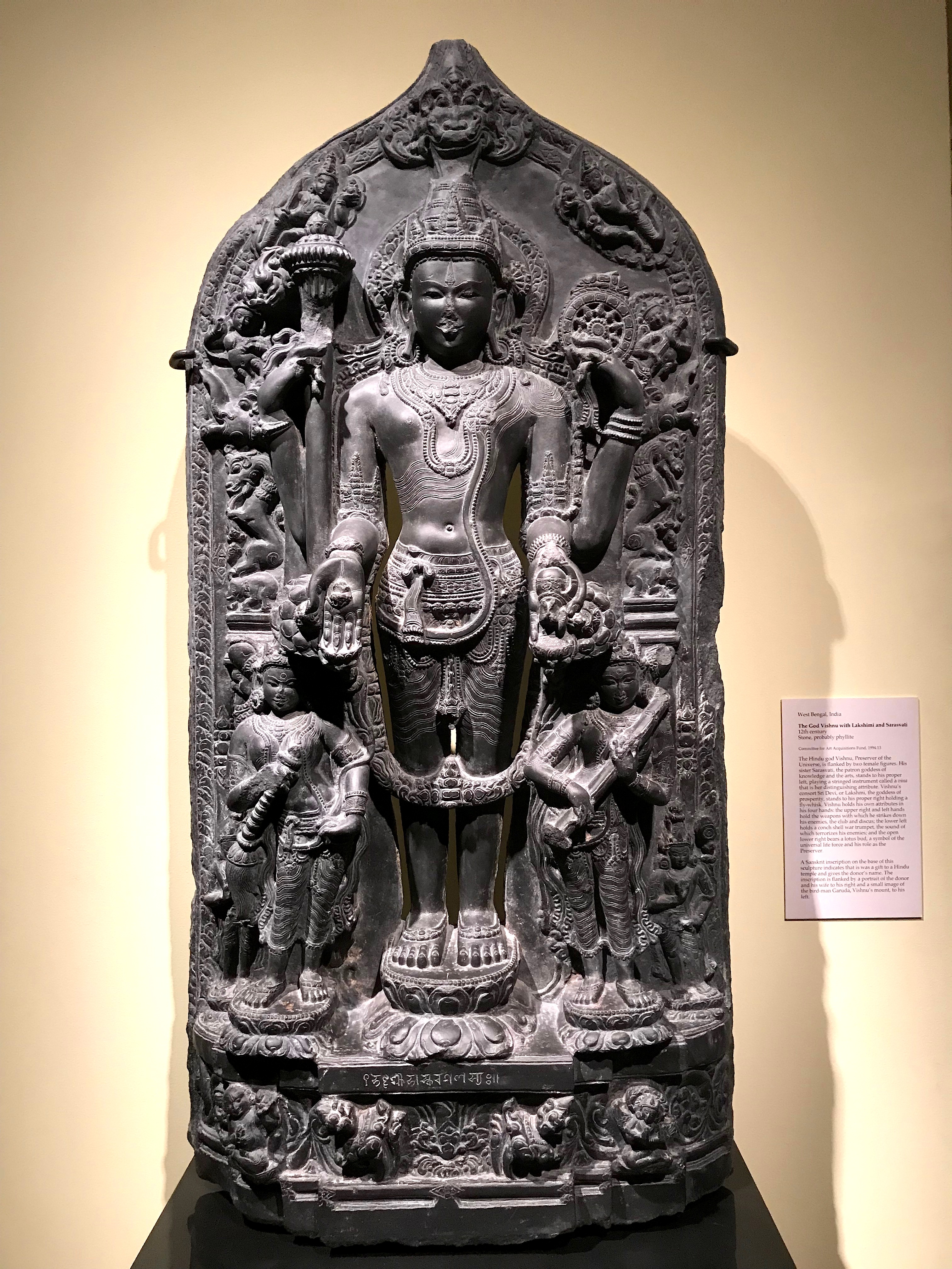 The Hindu god Vishnu, the preserver of the universe, is flanked by two female figures. His sister Sarasvati, the patron goddess of knowledge and the arts, stands to his proper left, playing a stringed instrument called a vina, which is her distinguishing attribute. Vishnu's consort Sri Devi, or Lakshmi, the goddess of prosperity, stands to his proper right holding a fly-whisk. Vishnu holds his own attributes in his four hands: the upper right and left hands hold the weapons with which he strikes down his enemies, the club and discus; the lower left holds a conch shell war trumpet, the sound of which terrorizes his enemies; and the open lower right bears a lotus bud, a symbol of the universal life force and his role as preserver. A Sanskrit inscription on the base of this sculpture indicates that it was a gift to a Hindu temple and gives the donor's name. The inscription is flanked by a portrait of the donor and his wife to his right, and small image of the bird-man Garuda and Vishnu's mountain, to his left. 12th century CE and is likely made of phyllite. It comes from West Bengal, India.
