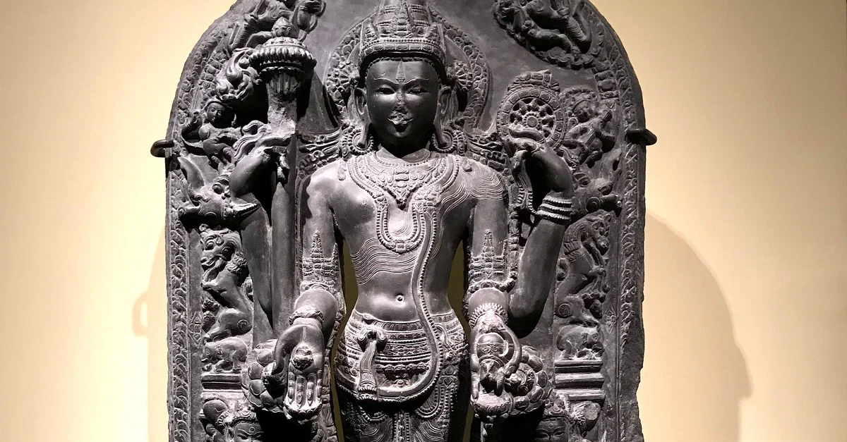 Vishnu with Lakshmi and Saravati, phyllite sculpture from West Bengal, India, 12th century.
