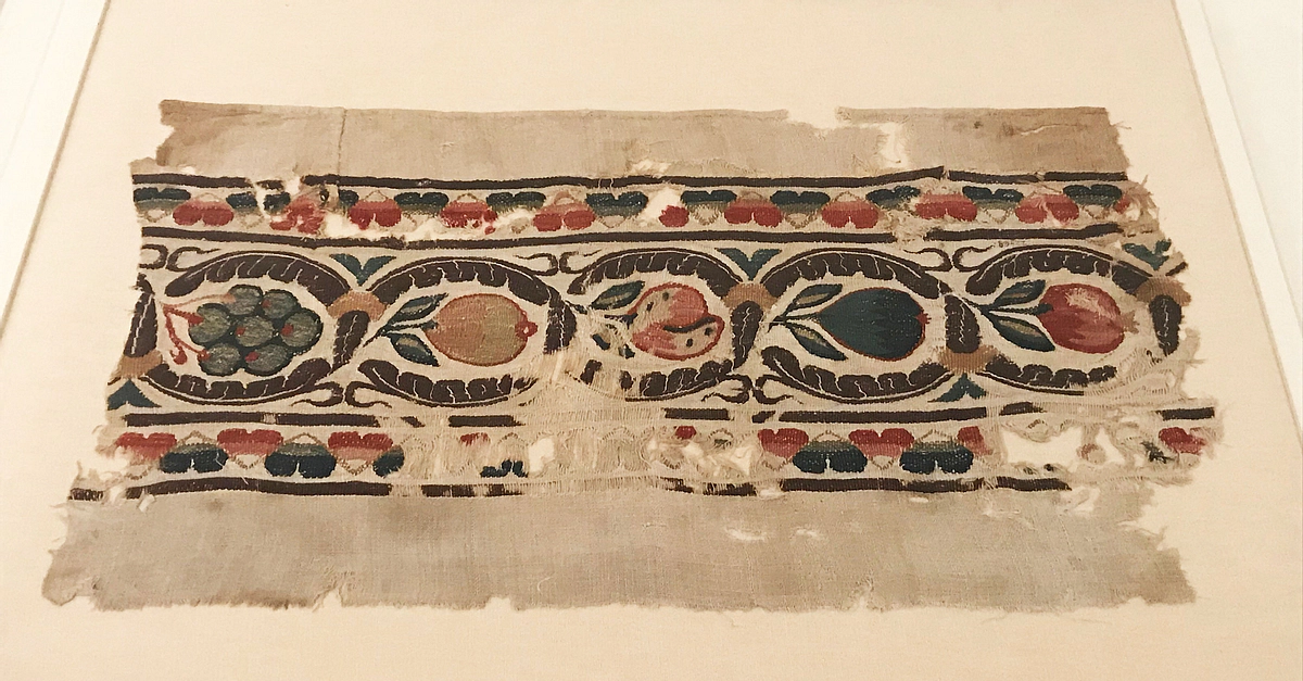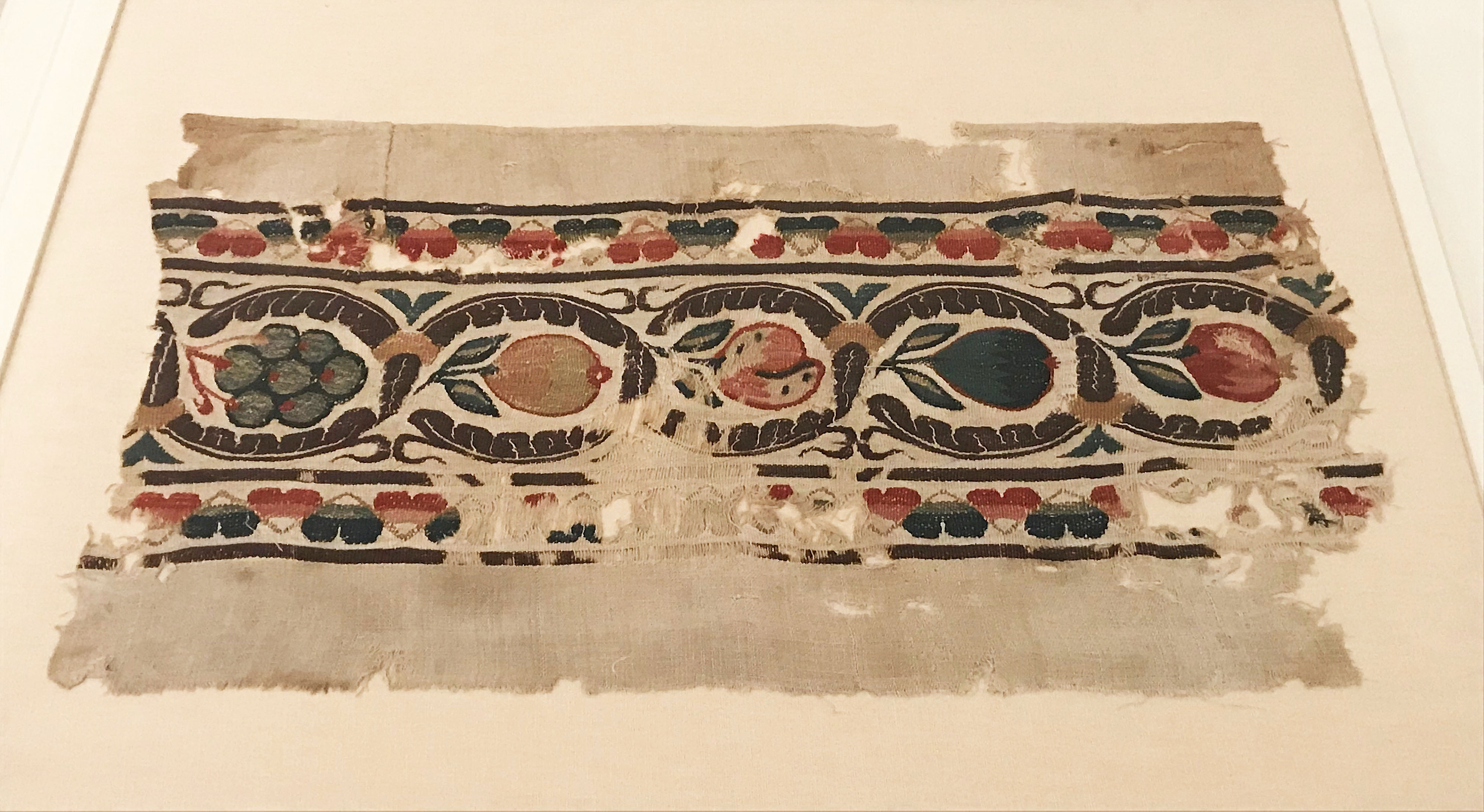This fruited medallion scroll band was made by the Coptic people of Egypt while under Byzantine occupation (330-641 CE). It is made of wool and linen, and dates from the 7th century CE. (Iris & B. Gerald Cantor Center for Visual Arts at Stanford University, Stanford, California)