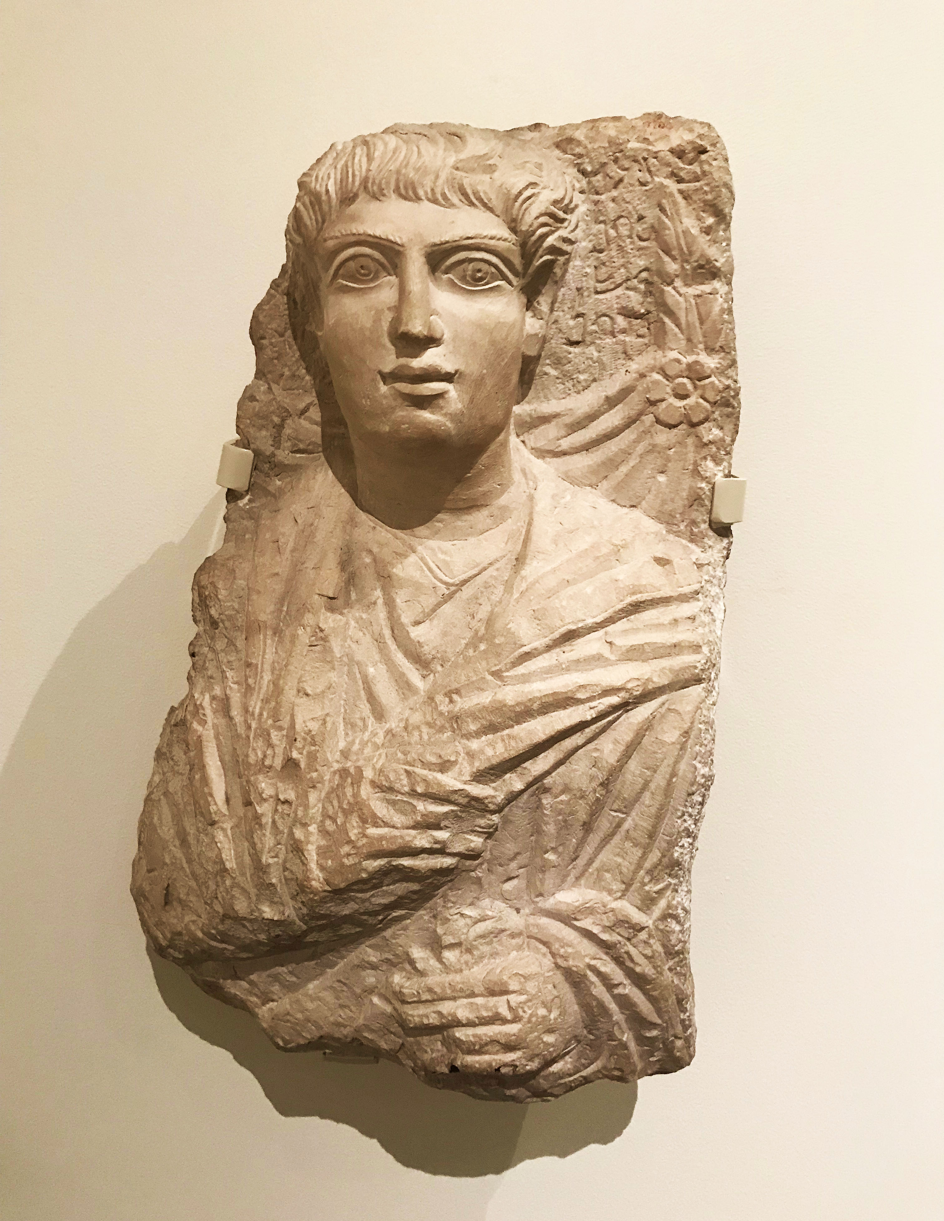 This is a funerary relief of a man who lived in Syria when it was under Roman occupation (64 BCE-260 CE). It dates from the 2nd century CE, and it is made of limestone. (Iris & B. Gerald Cantor Center for Visual Arts at Stanford University, Stanford, California)