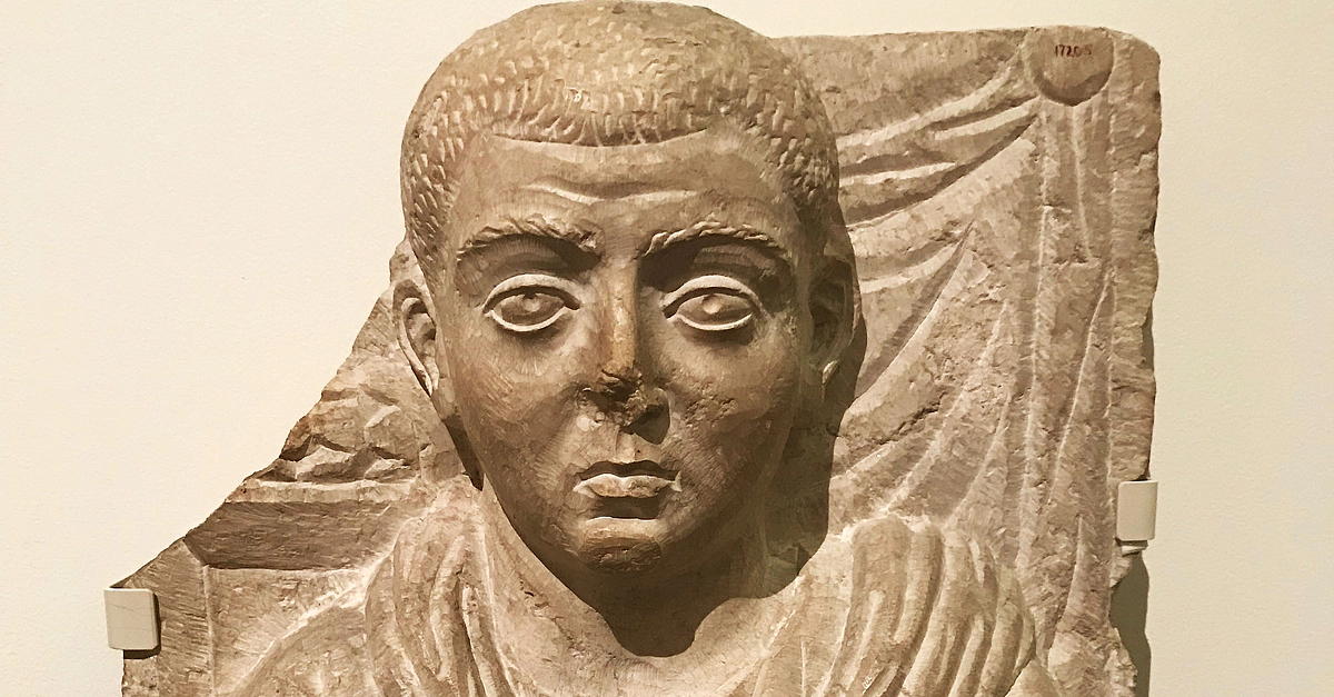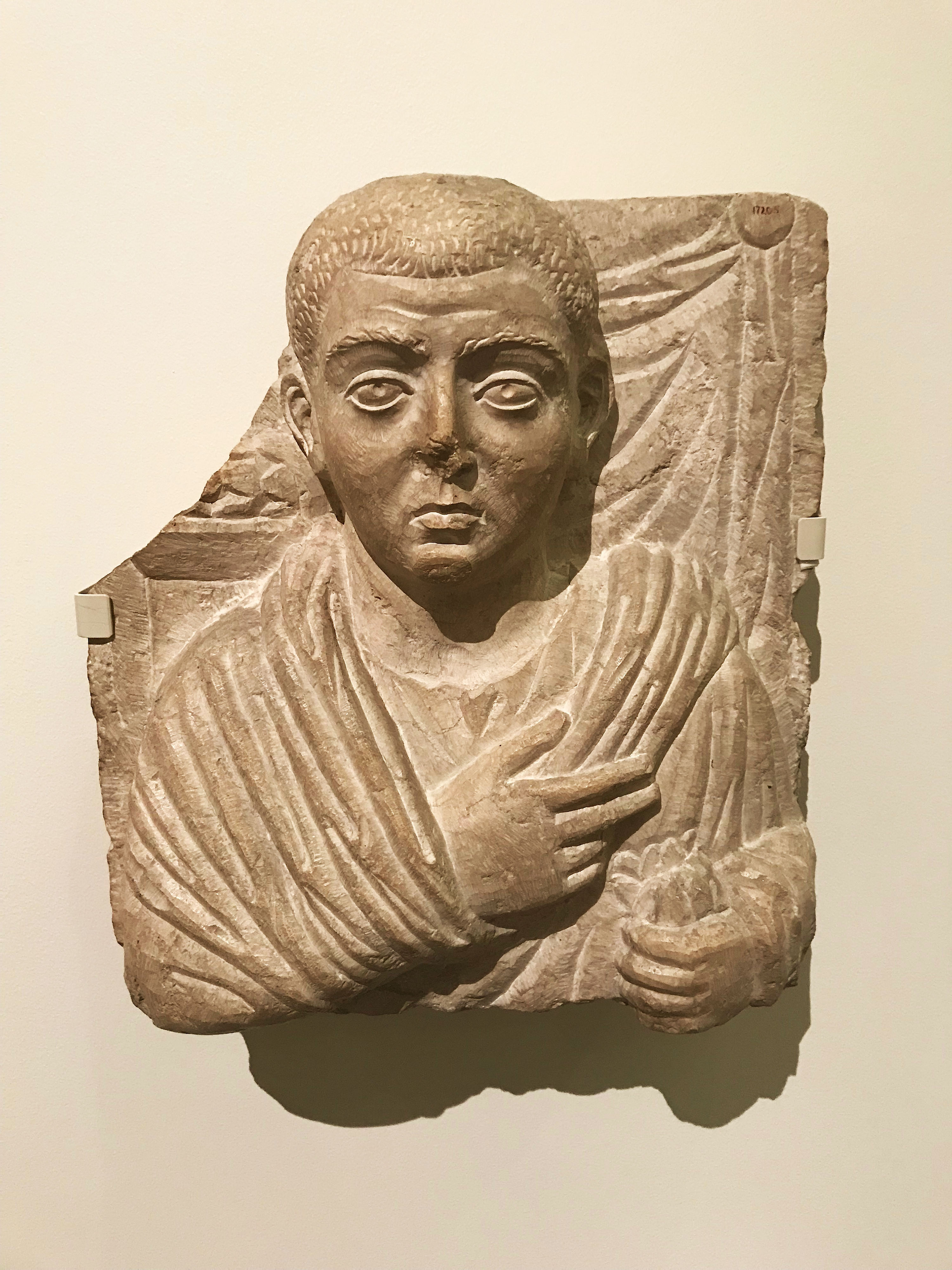 This is a funerary relief of a old man who lived in Syria when it was under Roman occupation (64 BCE-260 CE). It dates from the 3rd century CE, and it is made of limestone. (Iris & B. Gerald Cantor Center for Visual Arts at Stanford University, Stanford, California)