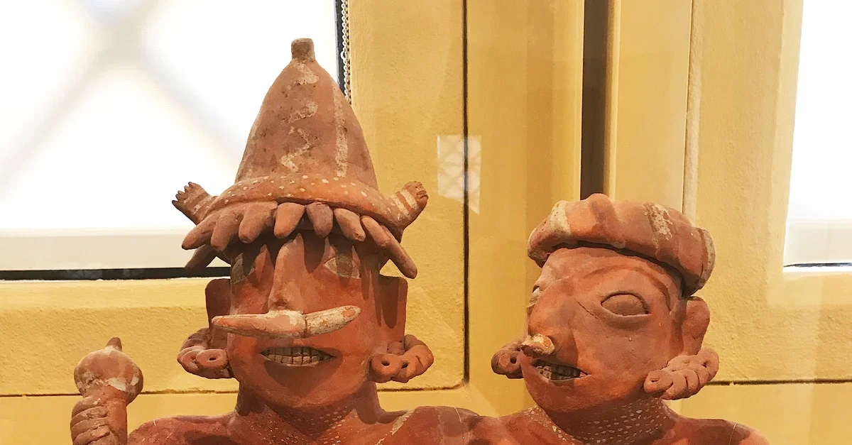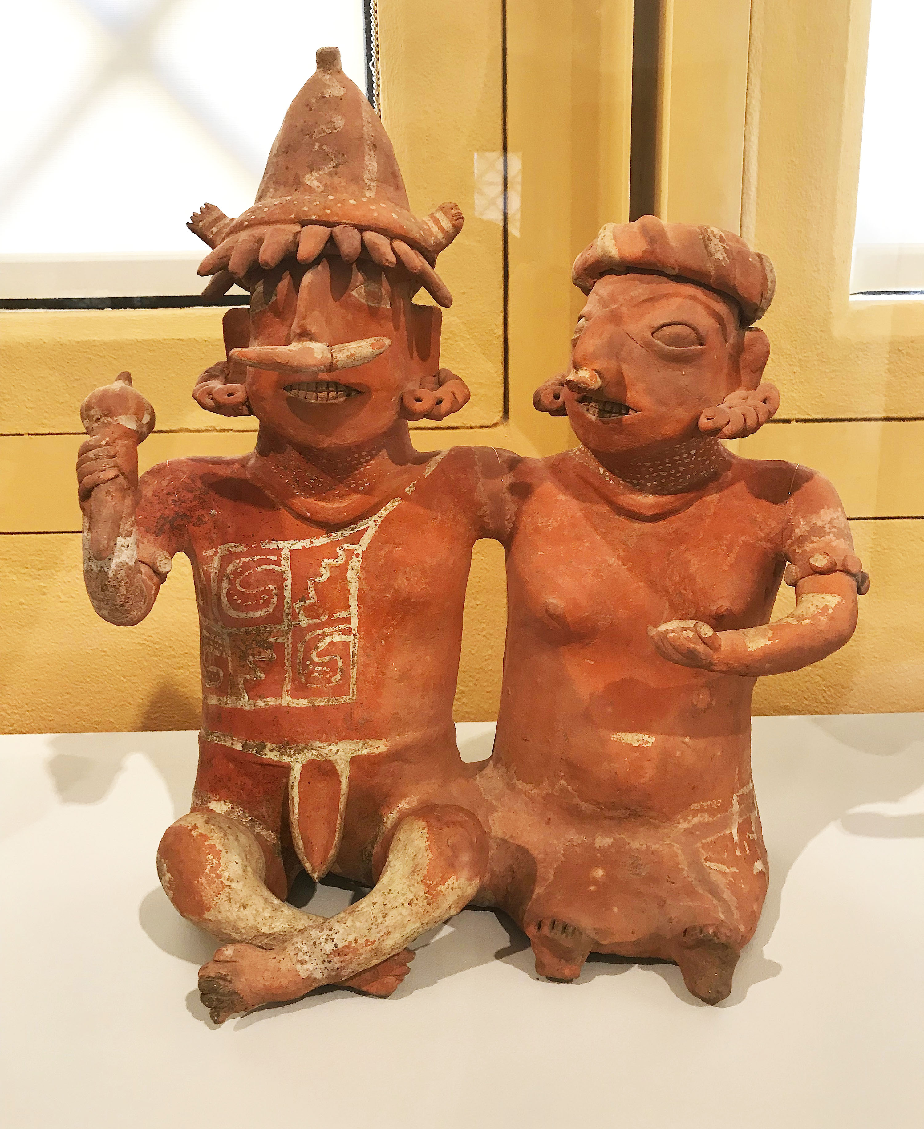 This sculpture of a joined male and female couple dates from 100 BCE-250 CE. It is a polychrome ceramic and comes from Nayarit, Mexico. (Iris & B. Gerald Cantor Center for Visual Arts at Stanford University, Stanford, California)