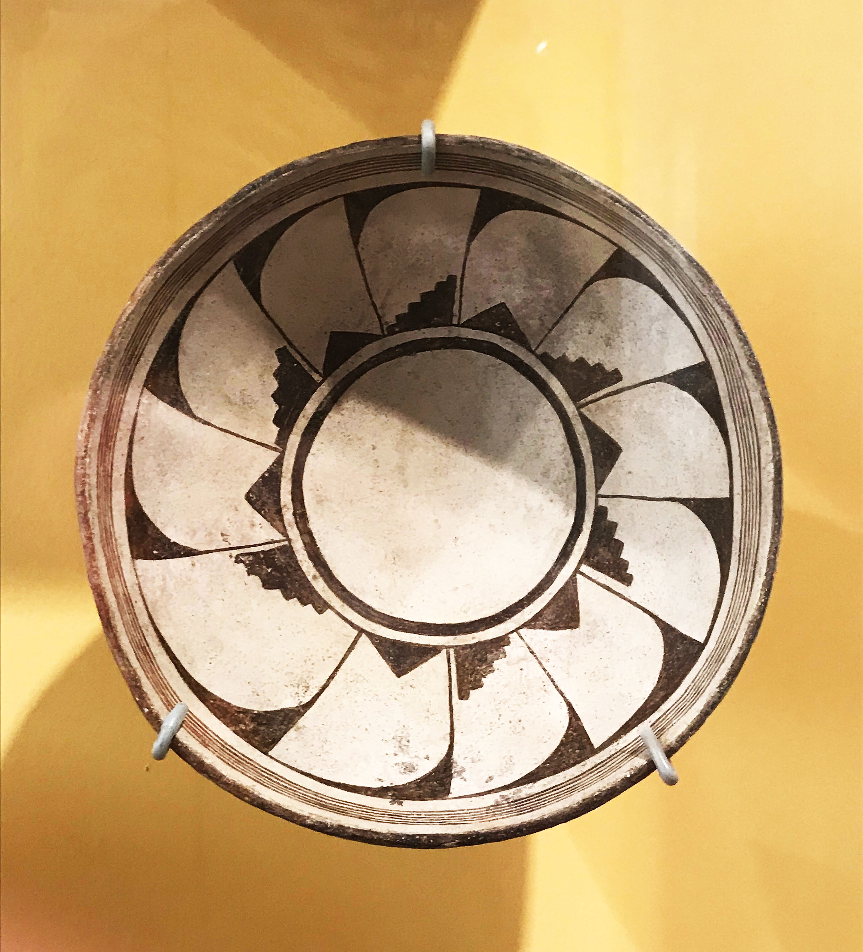 This Mimbres ceramic vessel dates from 1000-1150 CE. It was made by the Mimbres people who inhabited what's present-day New Mexico from c. 1000-1250 CE. Early Mimbres vessels were decorated with geometric designs painted in black and white. Combinations of circles and triangles, spirals, and thin parallel lines were arranged in three or four implied segments on the interior surface of the round vessels, often suggesting a swirling momentum. Later, in a dramatic innovation, Mimbres potters introduced human and animal forms, including mammals, reptiles, insects, birds, and mythical creatures. Mimbres designs, especially the so-called feather pattern, have been adapted by 20th-century Pueblo potters. Mimbres vessels were made to hold good and water, and served ritual purposes as well. many were intended to provide the dead with sustenance in the next world. If a pot was to be buried, it was first pierced in the center—or "killed"—with a sharp tool to release the spirit within it. (Iris & B. Gerald Cantor Center for Visual Arts at Stanford University, Stanford, California)