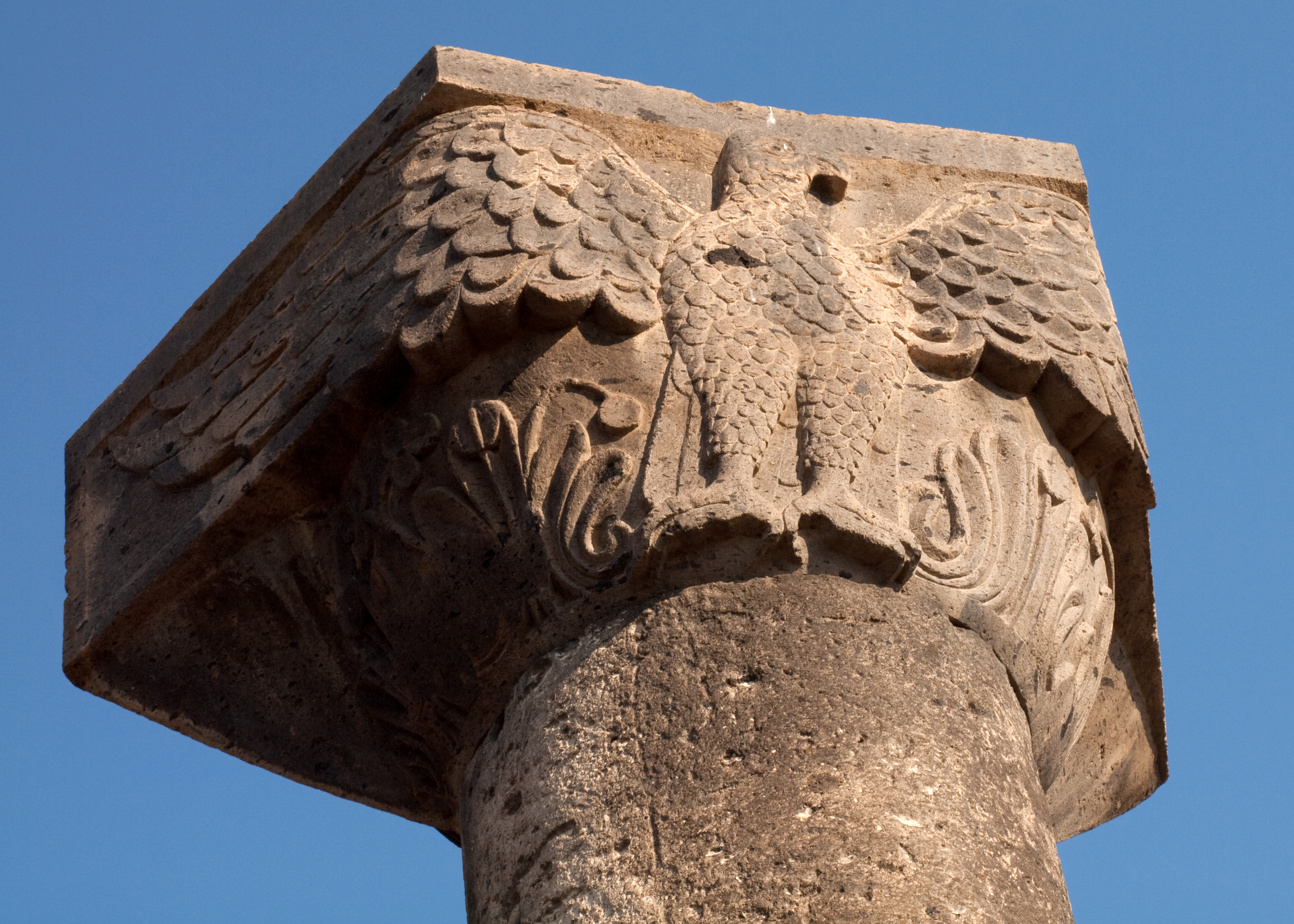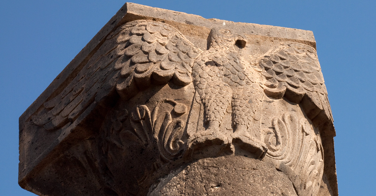 Zvartnots is the oldest and largest aisled tetraconch church in historical Armenia. It was built in the middle of the 7th century CE, under the instructions of the Catholicos Nerses III (r. 641-661 CE). Four column capitals decorated with eagles once stood in front of the cathedral’s four main piers, facing the ambulatory. The eagle with outstretched wings was a potent symbol of imperial Byzantine power.