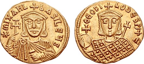 A gold coin depicting Byzantine emperor Michael II (r. 820-829 CE) and his heir and successor Theophilos. (Classical Numismatic Group, Inc. http://www.cngcoins.com)
