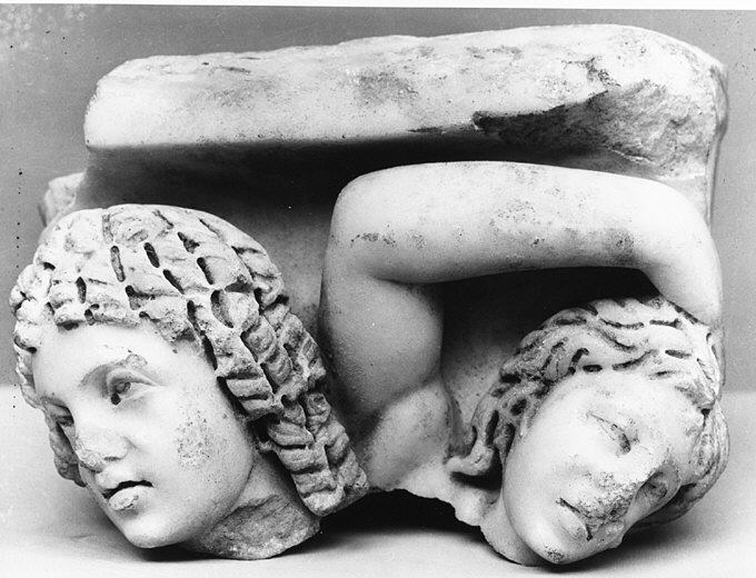 This fragment from the upper right corner of a sarcophagus portrays the head of a male Aethiopian (African) youth and a maenad. The piece dates to around the early 3rd Century CE and is a part of the Roman Sarcophagi Collection at the Metropolitan Museum of Art, New York.