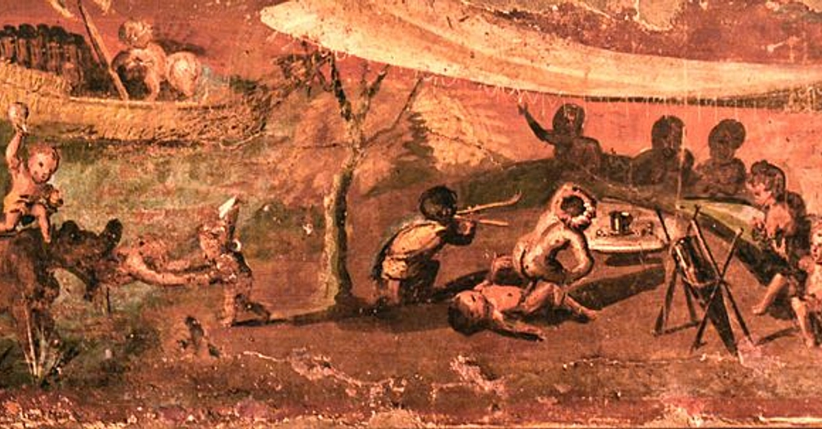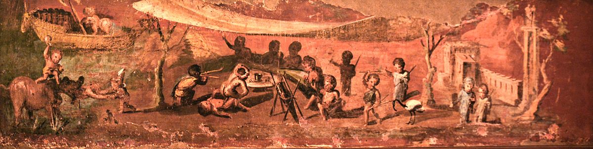 This 1st Century CE fresco is part of a cycle in the "House of the Physician" in Pompeii portrays pygmies living along the Nile. This scene depicts a banquet accompanied by music and sex acts. The fresco currently resides in the National Archaeological Museum of Naples and has been dubbed the "Banquet of the Pygmies".