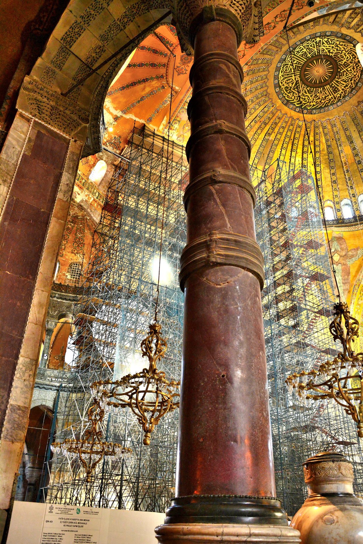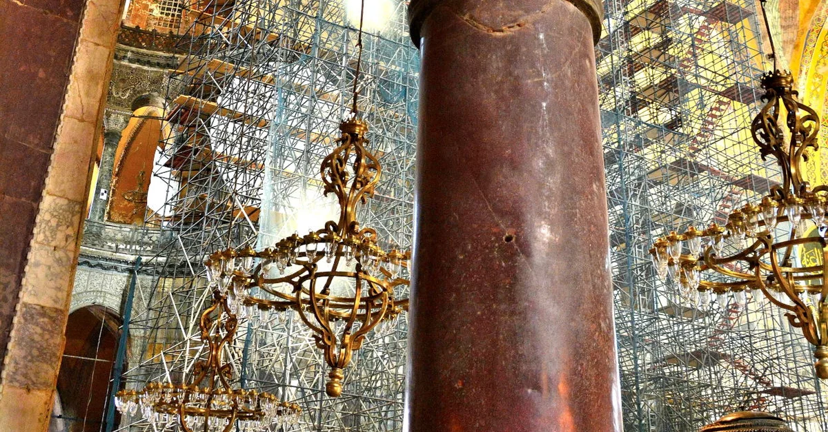 A column of Hagia Sophia, 6th century CE, Hagia Sophia, Istanbul, Turkey. In Hagia Sophia, there are 140 monolithic columns which were brought from different places of the world. For instance; the 8 porphyry columns whose color of purple symbolize nobility of the Byzantine Empire, are from Egypt and stand under semi-domes.