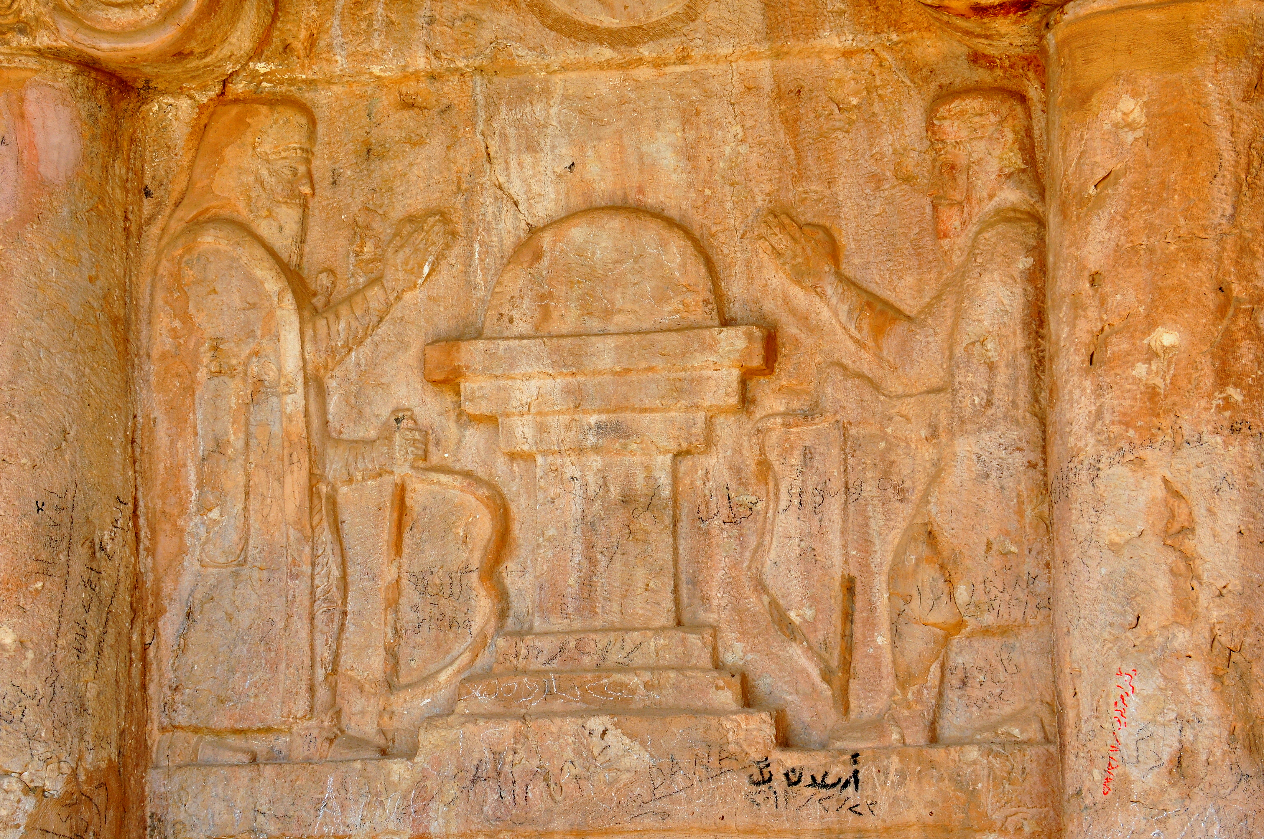 This is the main scene, carved between the engaged Iranian ionic-style columns and above the entrance into the main chamber of the rock-cut tombs of Ashkawt-i Qizqapan (Kurdish: The Cave of the Ravisher or the Cave of the Raped/Abducted Girl). Two standing men face each other, holding a combined double-convex bow in their left hands while raising their right hand in a gesture of reverence or salutation. In between them, there is a stepped altar. A semi-circle sits on the altar; this may represent a fire. Median-Achaemenid Period, 600-330 BCE. Near Zarzi village and the Palaeolithic cave of Zarzi, Chemi Rezan Valley, Sulaymaniyah Governorate, Iraqi Kurdistan.