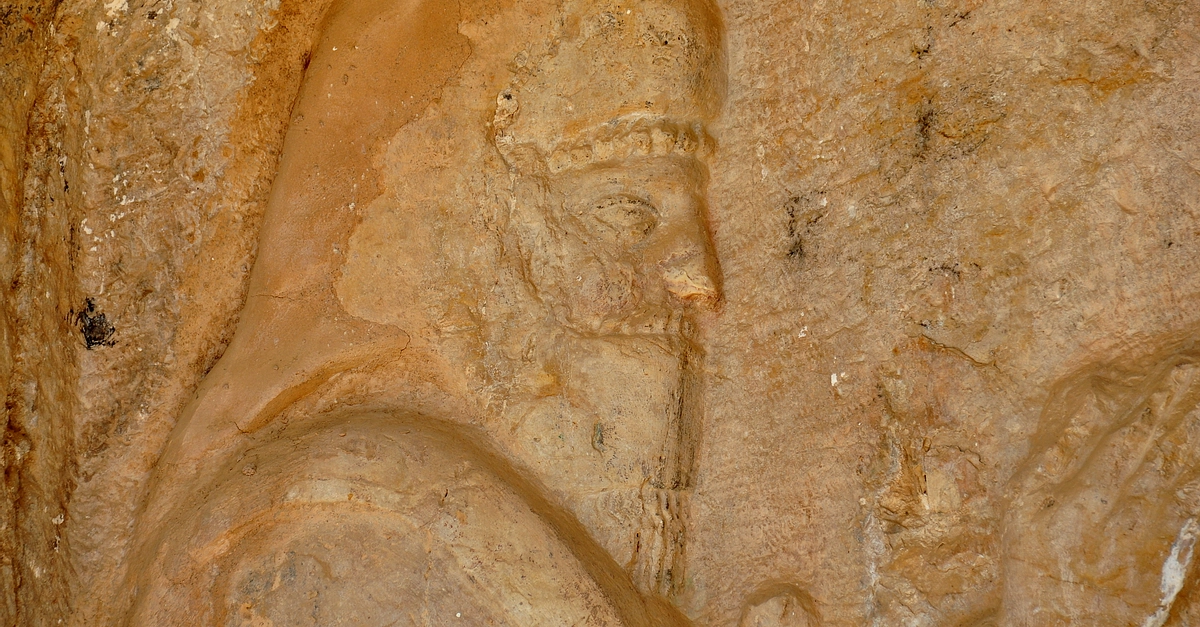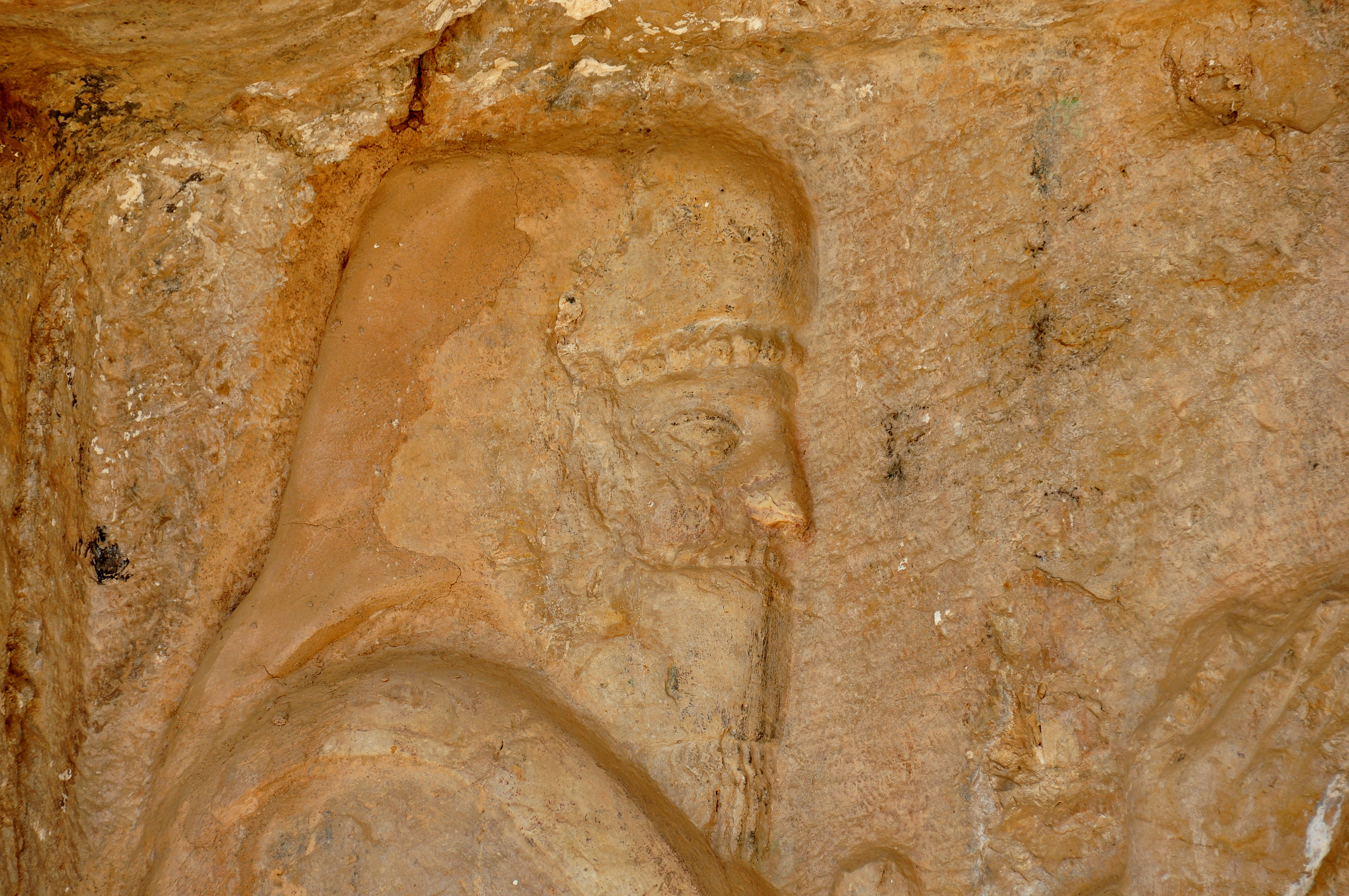 Detail of the relief carved at the façade of the rock-cut tombs of Ashkawt-i Qizqapan (Kurdish: The Cave of the Ravisher or the Cave of the Raped/Abducted Girl). This man stands on the left side. He wears what appears to be a “tiara”; a headdress which covers the head, neck, ears, cheeks, and chin. This headdress is Median in type and is called a “bashlyk”. In addition, a piece of cloth covers the mouth (very similar to the magi of Zoroastrianism, who wore such a fabric to protect the sacred fire from their "polluted breath"). The forehead hair, moustache, and beard are clearly seen. Median-Achaemenid Period, 600-330 BCE. Near Zarzi village and the Palaeolithic cave of Zarzi, Chemi Rezan Valley, Sulaymaniyah Governorate, Iraqi Kurdistan.